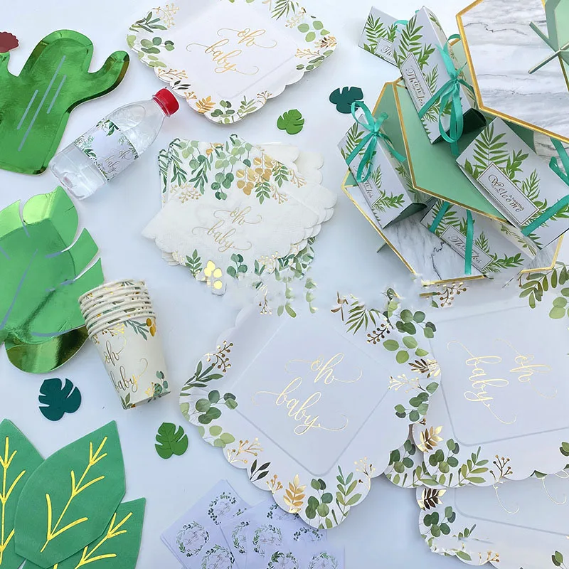 8Guests Gold Letter Oh Baby Disposable Tableware Jungle Leaves Napkin Plate Cup Baby Shower Boy Girl...