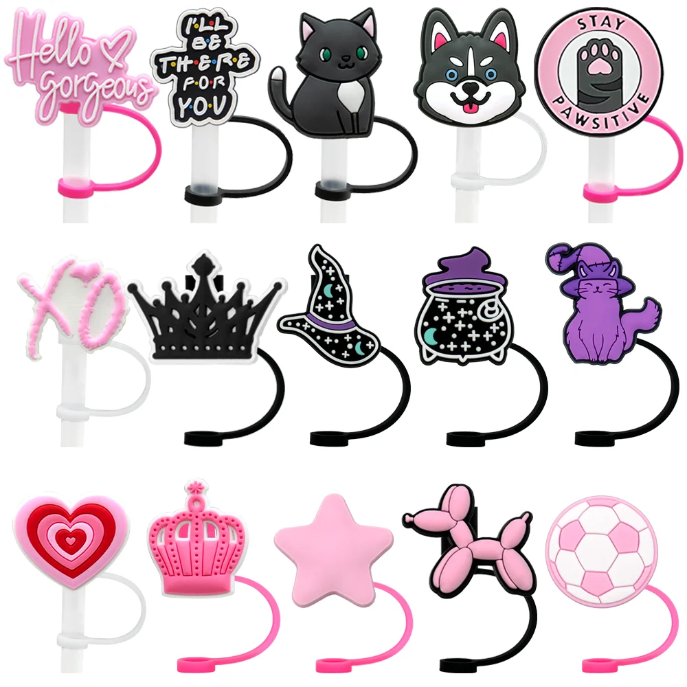 1PCS Cool Black Cat Silicone Straw Cover Cap,10mmCrown Pink Heart S...