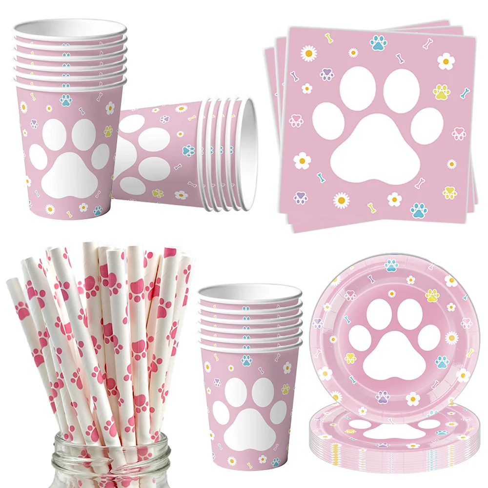 Pink Paw Print Party Tableware Dog Pink Puppy Birthday Party Paper Plates Napkins Decorations Kids B...