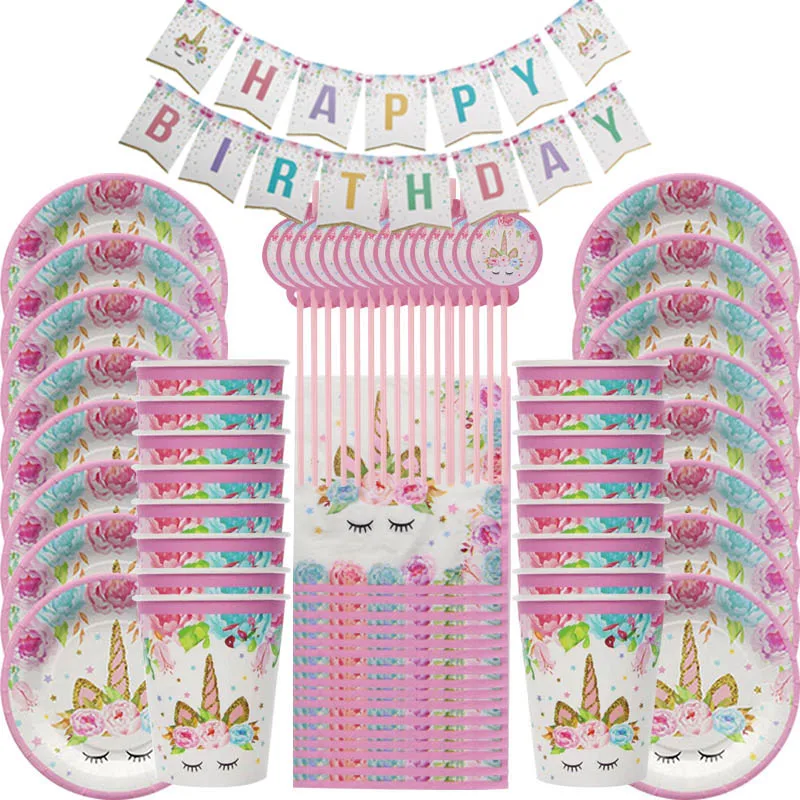 Rainbow Unicorn Party Disposable Tableware Set Paper Plate Cup Tablecloth Banner Set Kids Birthday D...
