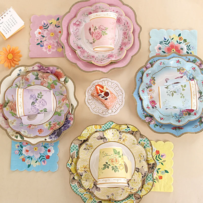Elegant Flower Party Tableware Set Scene Decoration Afternoon Tea Party Paper Plate Cup Tissue Set W...
