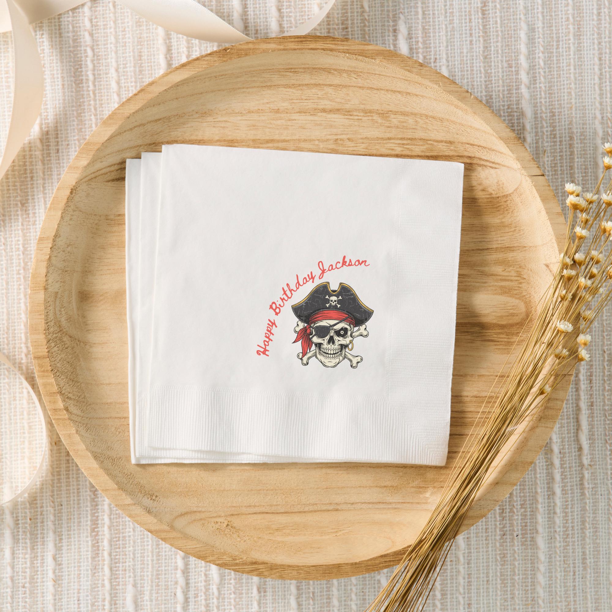 Custom Pirate Birthday Napkins perfect for a Captain Pirate Boy Birthday Theme. These white coined n...