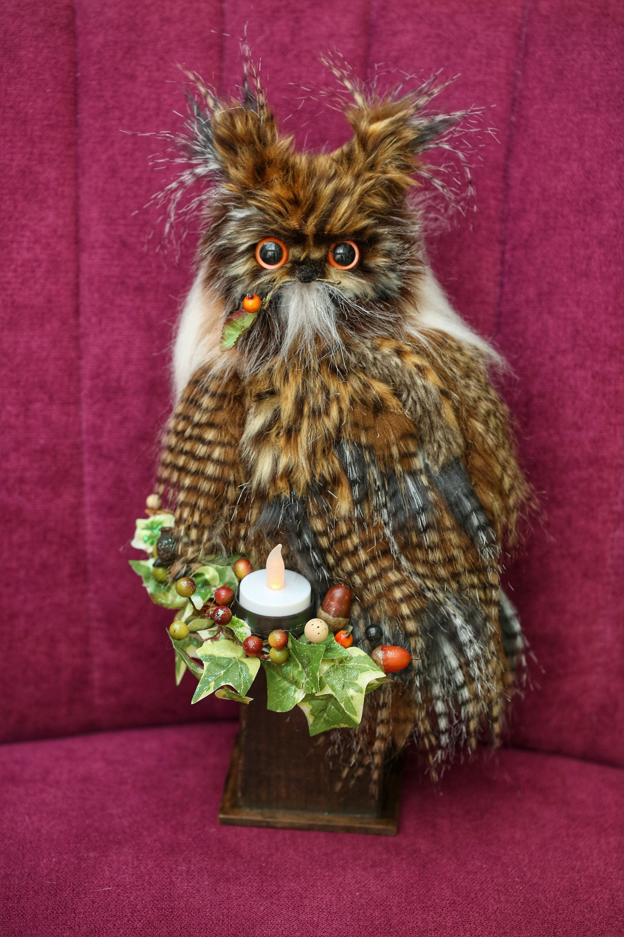 Giant Eagle Owl Decoration made from Fabric, Faux fur and stuffing with a wooden base. The owl has a...