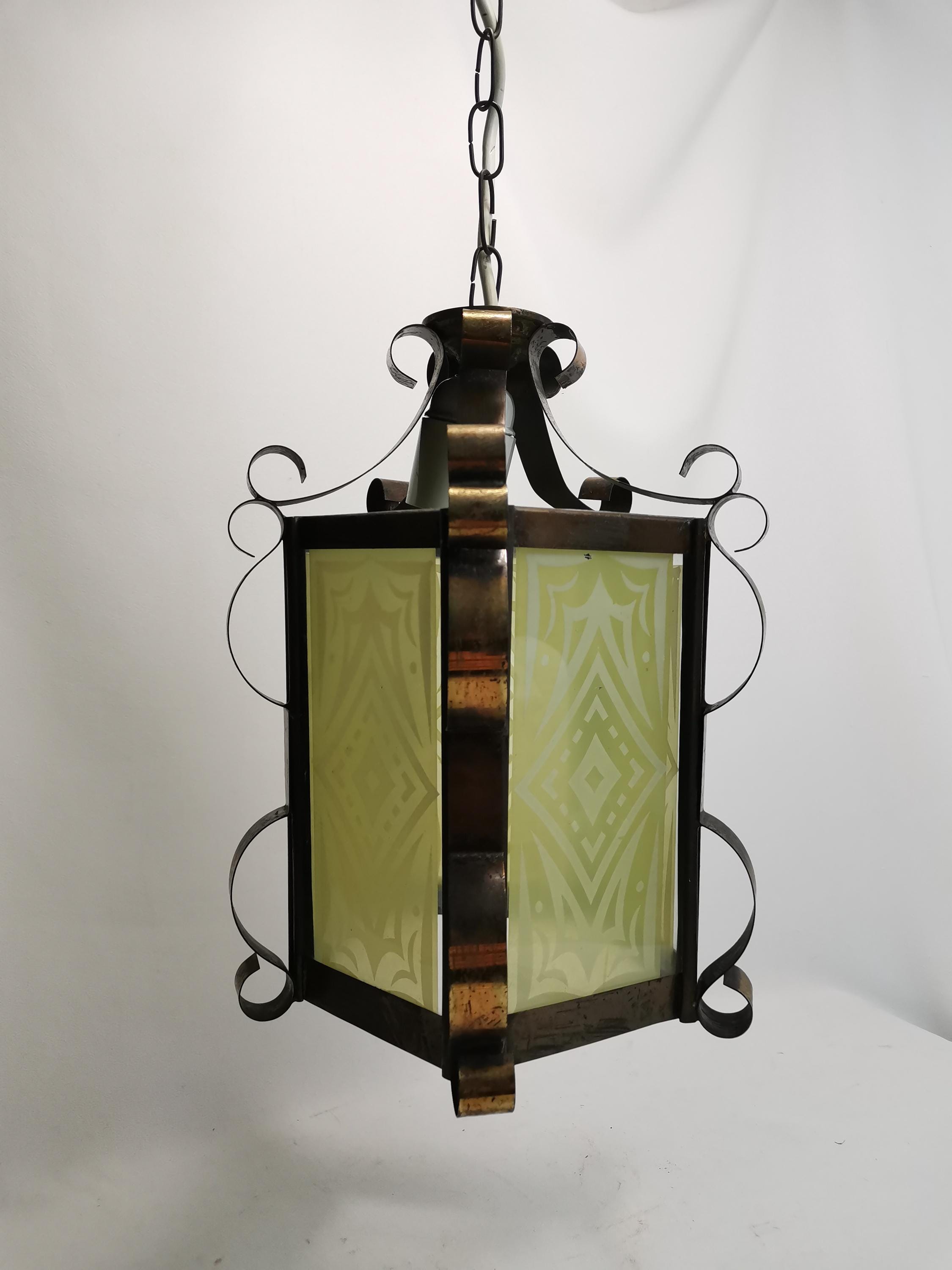 Antique lantern with painted glass panels in lemon yellow 1930s sma...