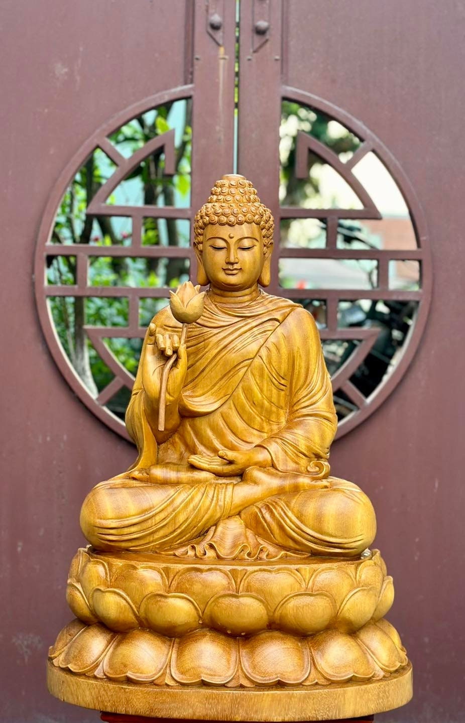 "Shakyamuni Buddha Statue Holding Lotus 19\", Wooden Sitting Gautama Buddha Statue on Lotu...