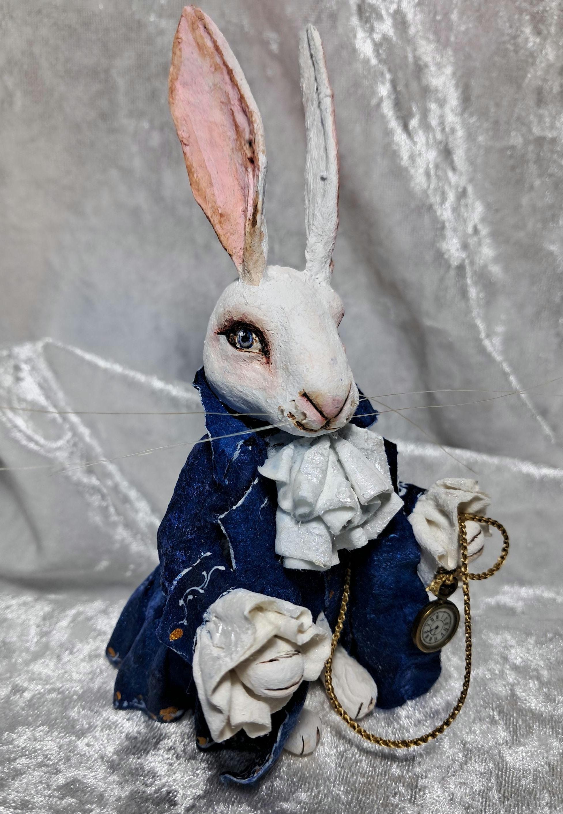 Spun cotton ornament rabbit, rabbit with clock, white rabbit, rabbi...