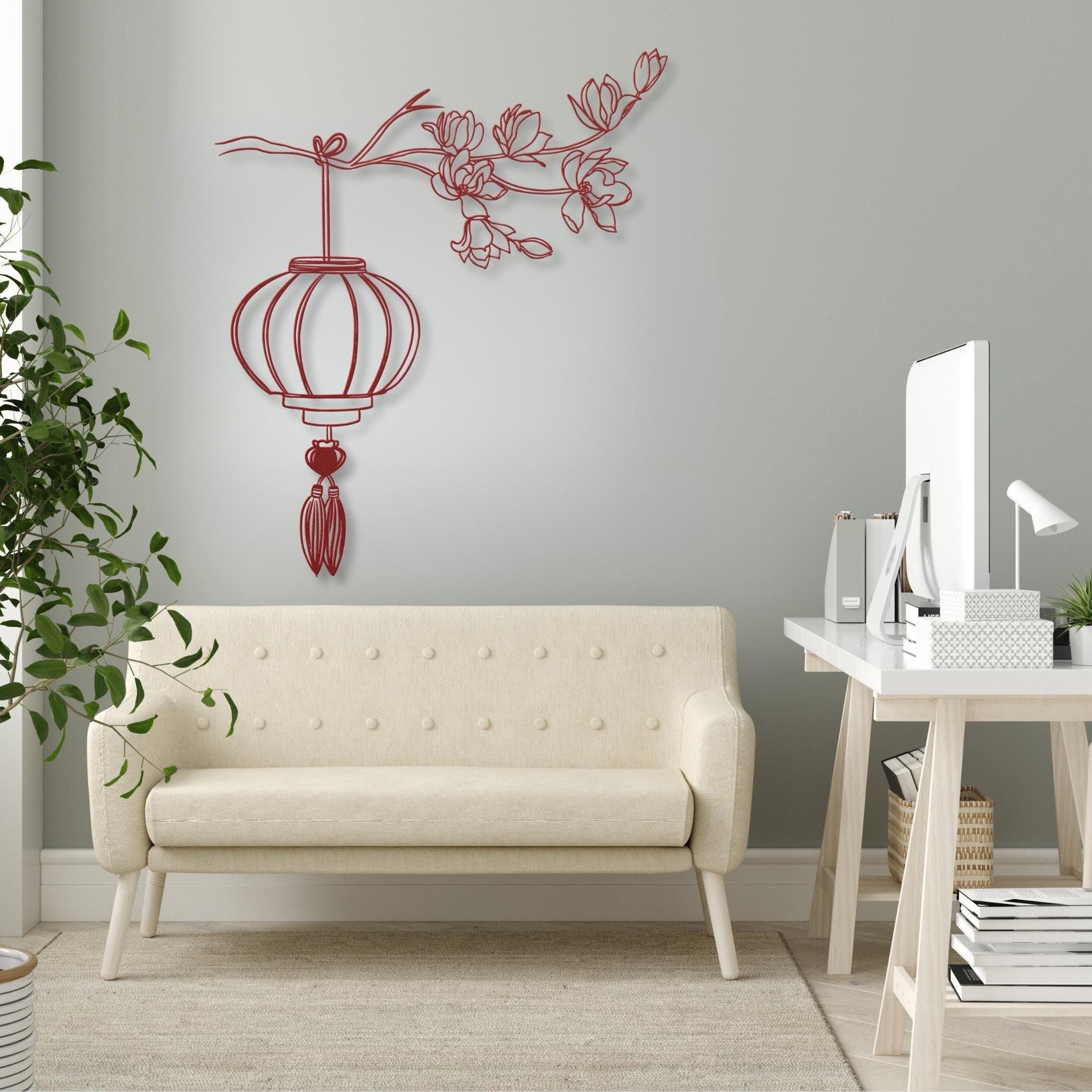 Metal Chinese Lantern on Cherry Blossom Tree Wall Sculpture, Minima...