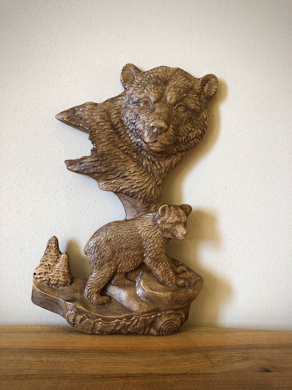 Wooden carved Bear and cub, Bearish Cute, bear ornament, Home decor...
