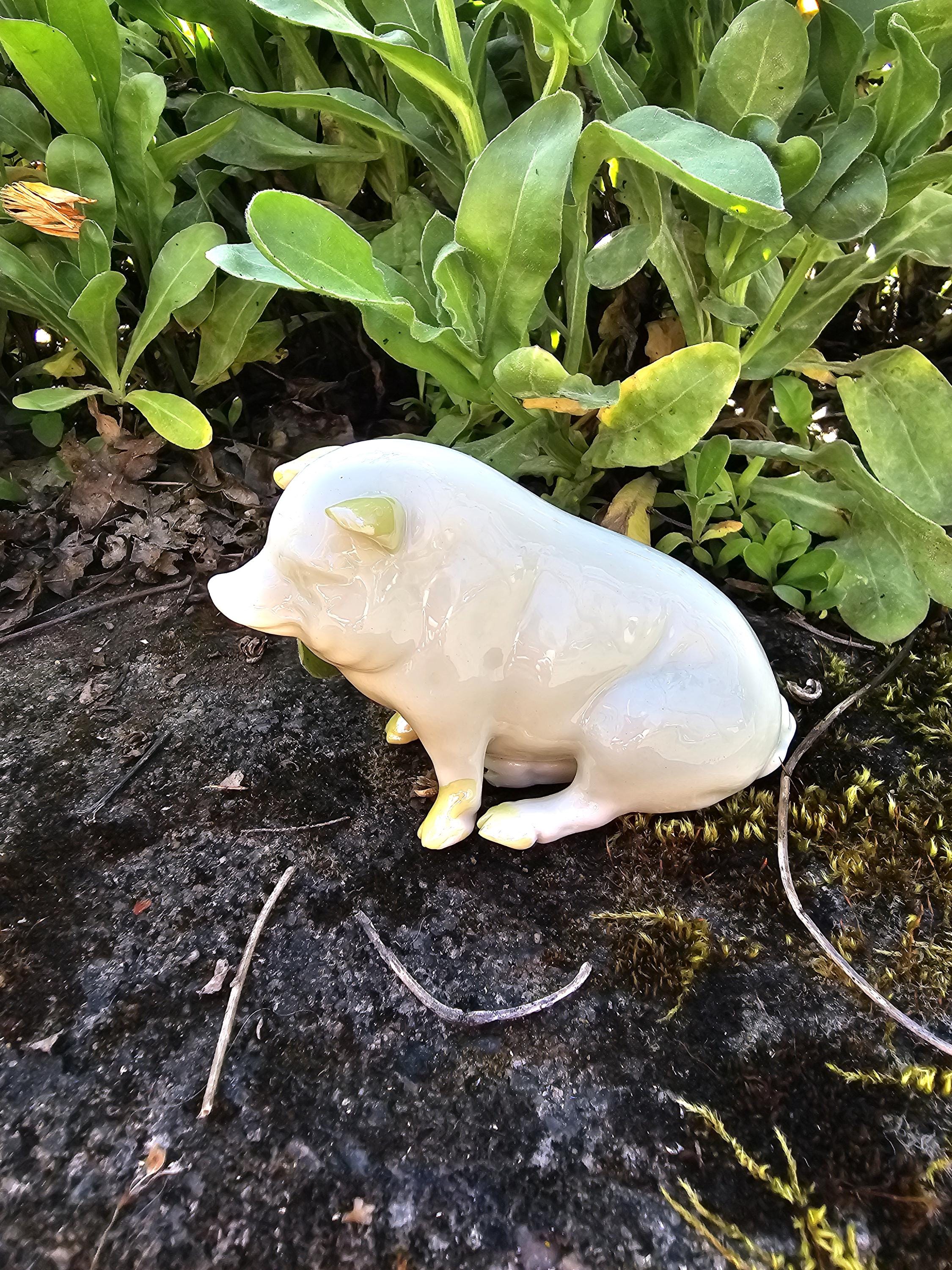 Vintage Belleek White & Yellow Luster Porcelain Sitting Pig 196...