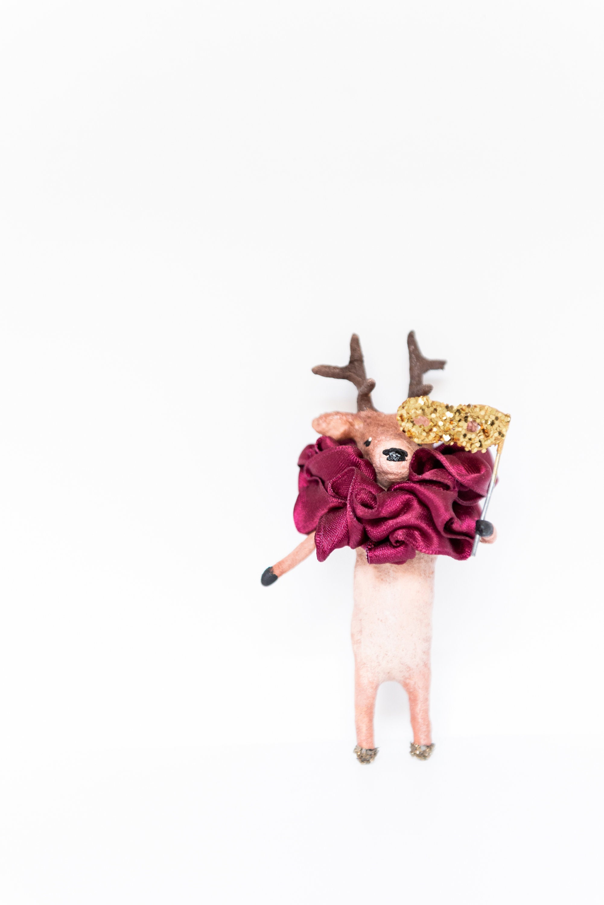 Cotton wool deer ornament, wearing a large, opulent burgundy collar and a golden Venetian mask. Let ...