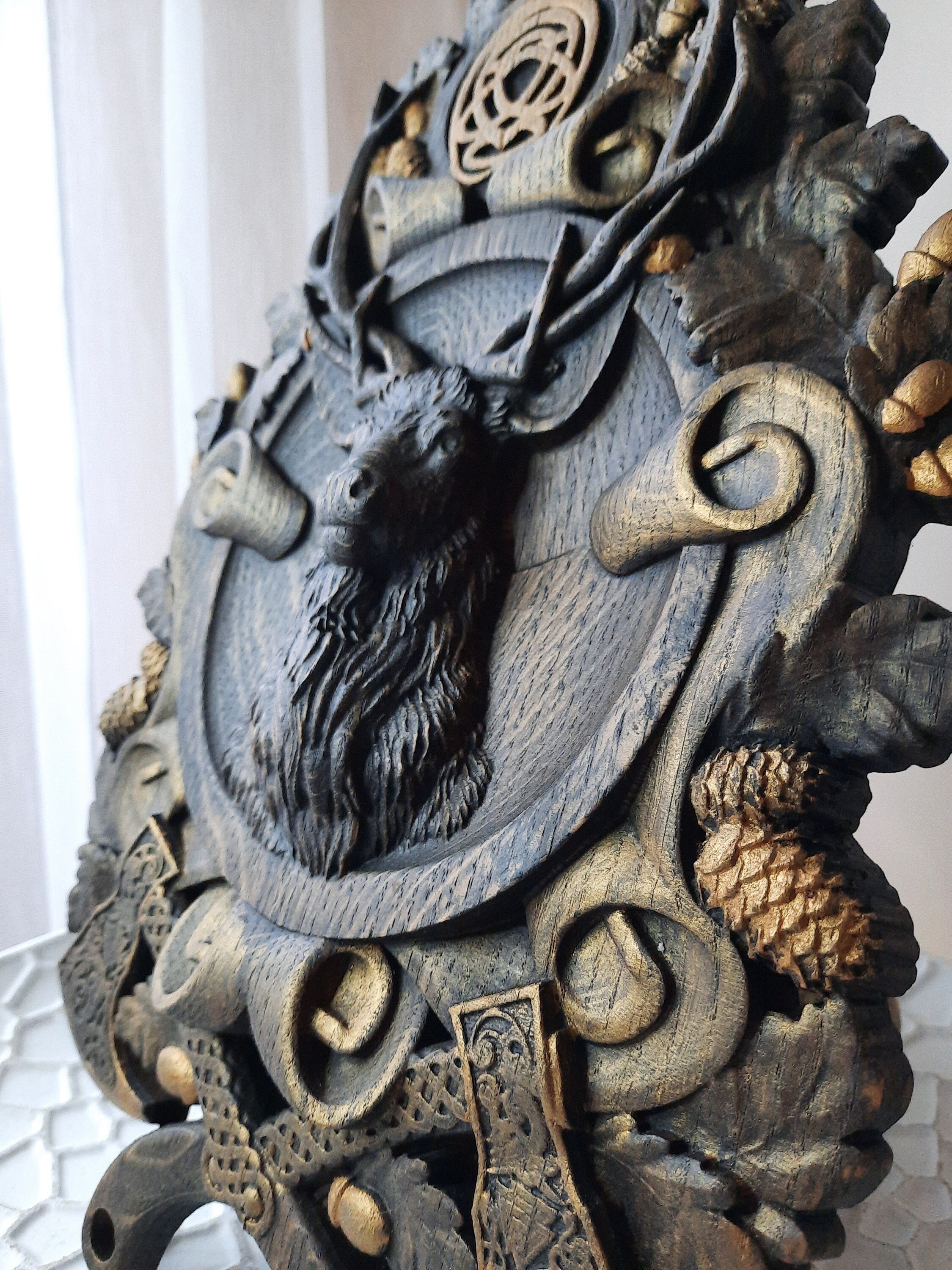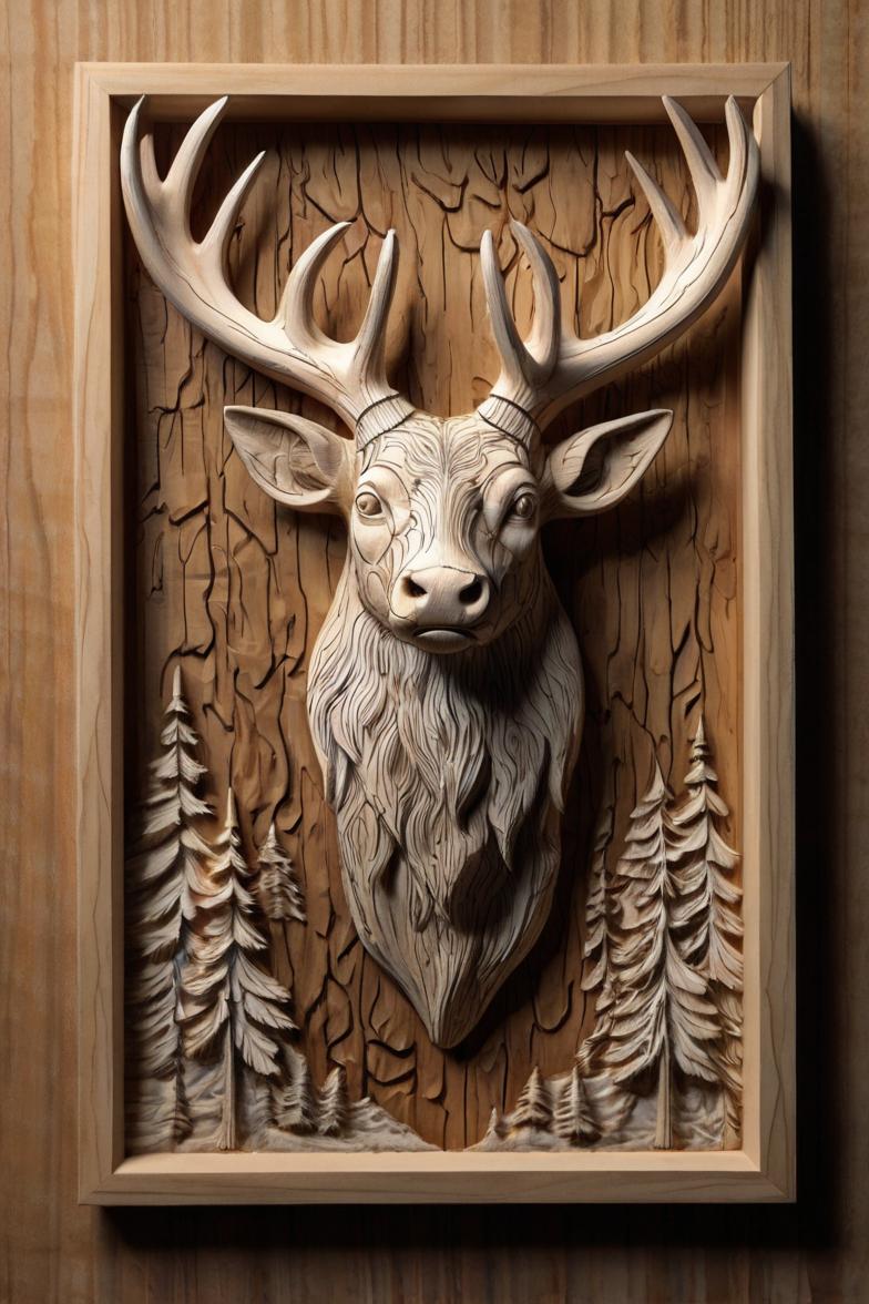 Deer wood carving, Wooden deer art, Deer horns wall hanging, Deer d...