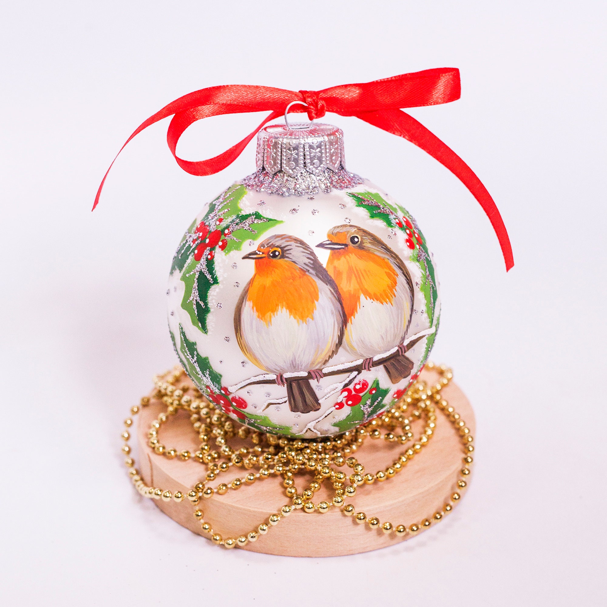 Couple of Robins Christmas Glass Ornament, Custom Hand Painted Silv...