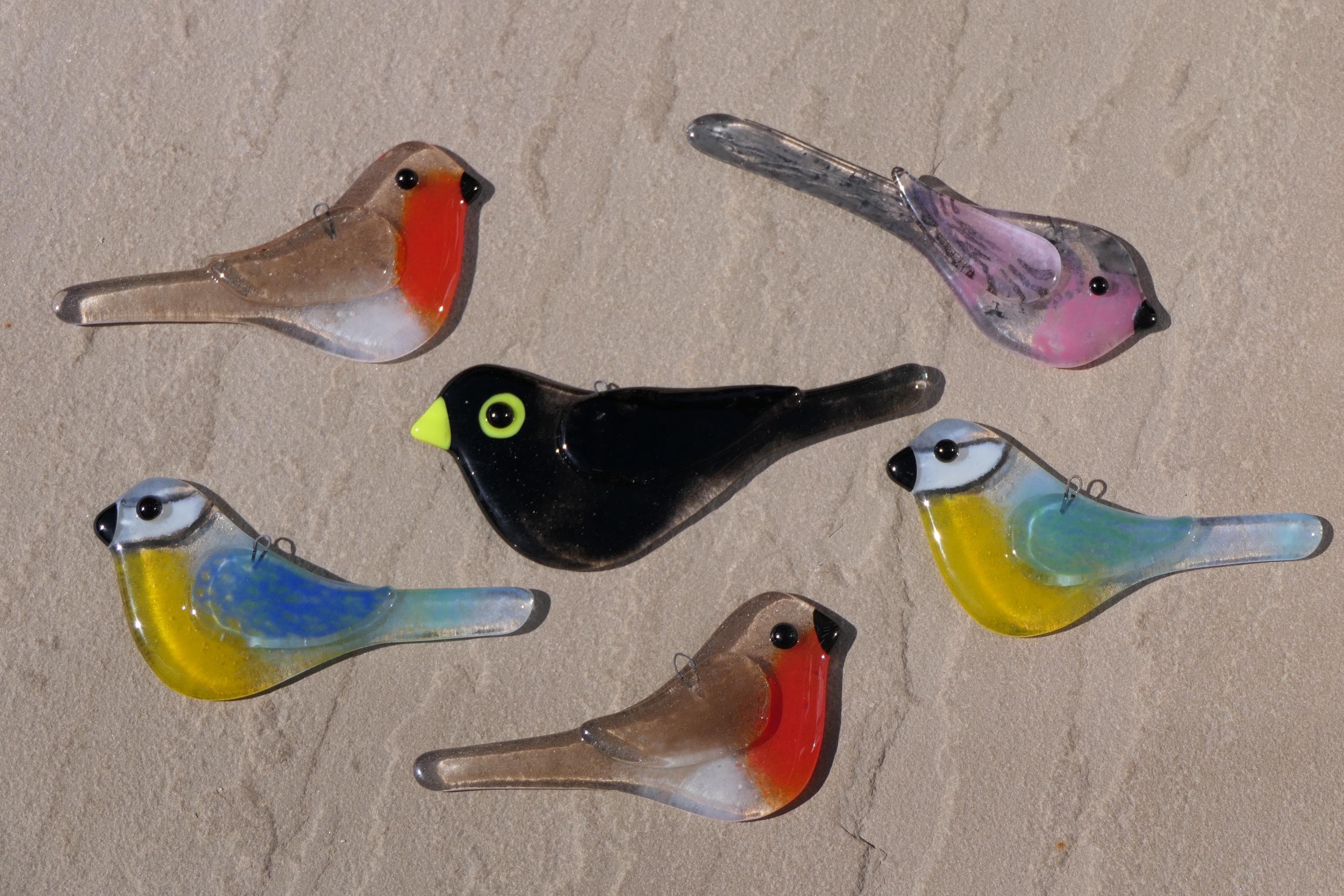 Hand cut fused glass birds, powdered glass was used to colour these birds so they will never fade. T...
