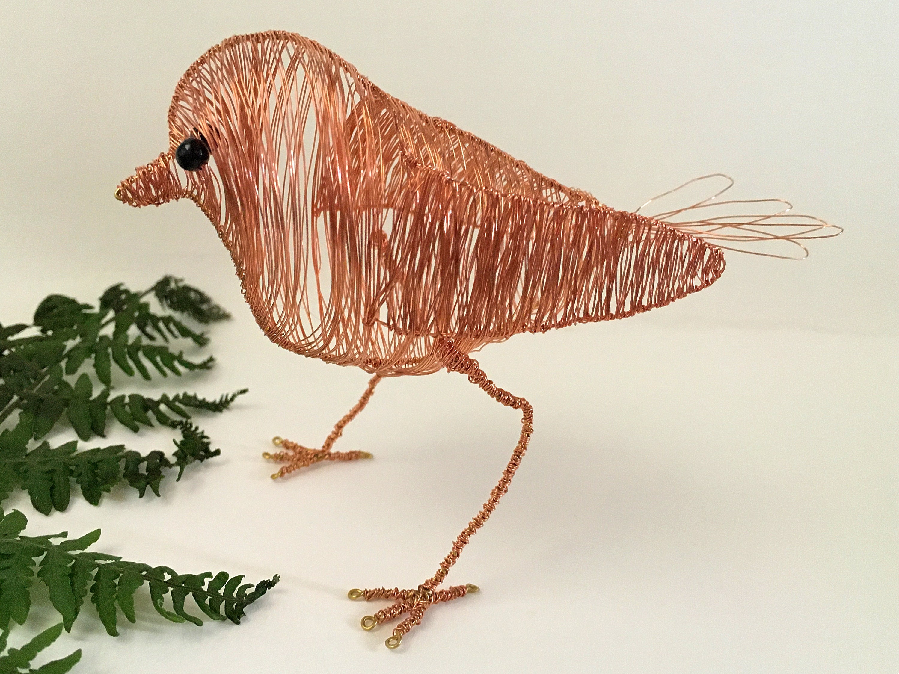 A wire Robin bird sculpture, using copper wire and coloured copper wires intertwined and threaded by...