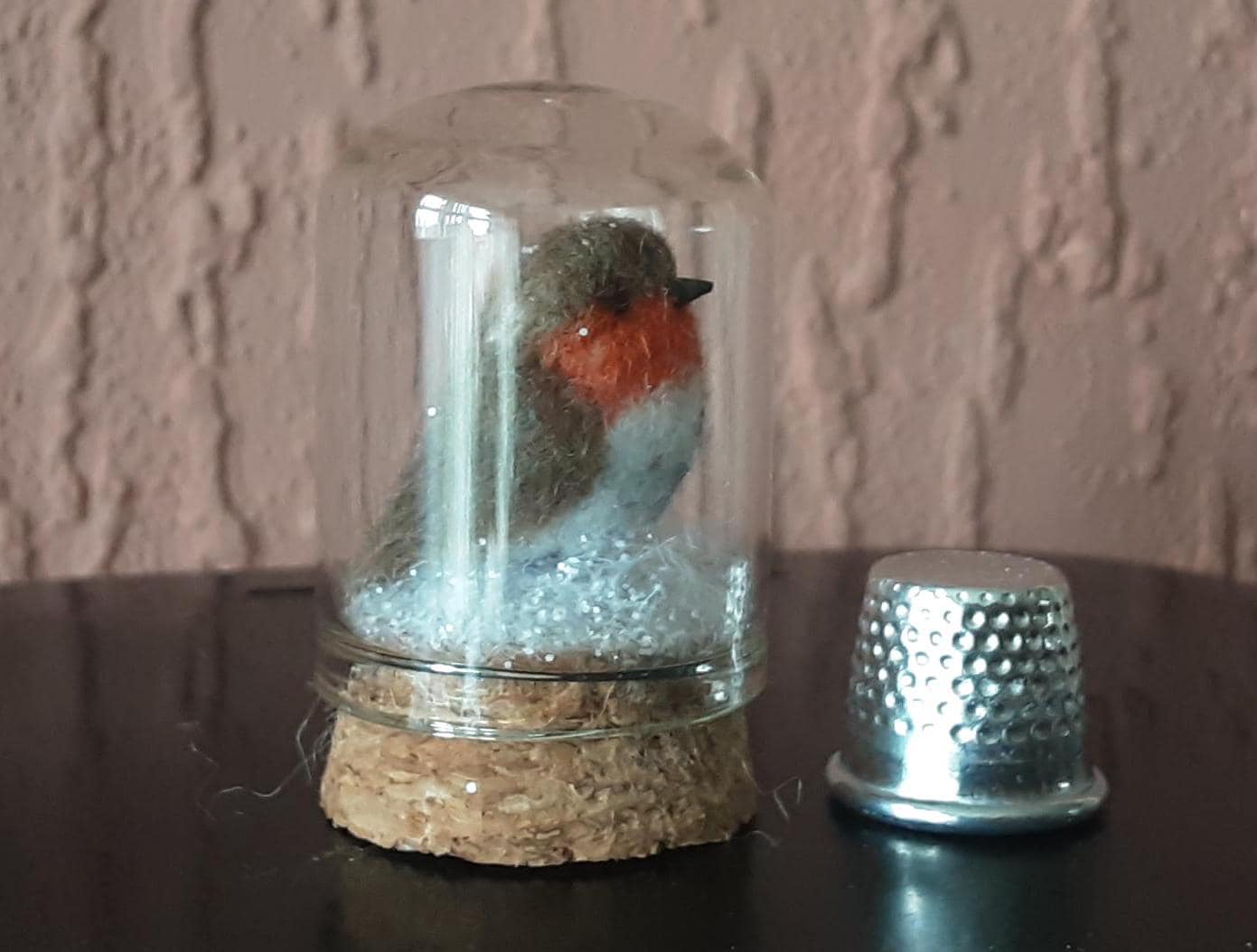 needle felted miniature robin, thimble robin in a glass dome, robin...