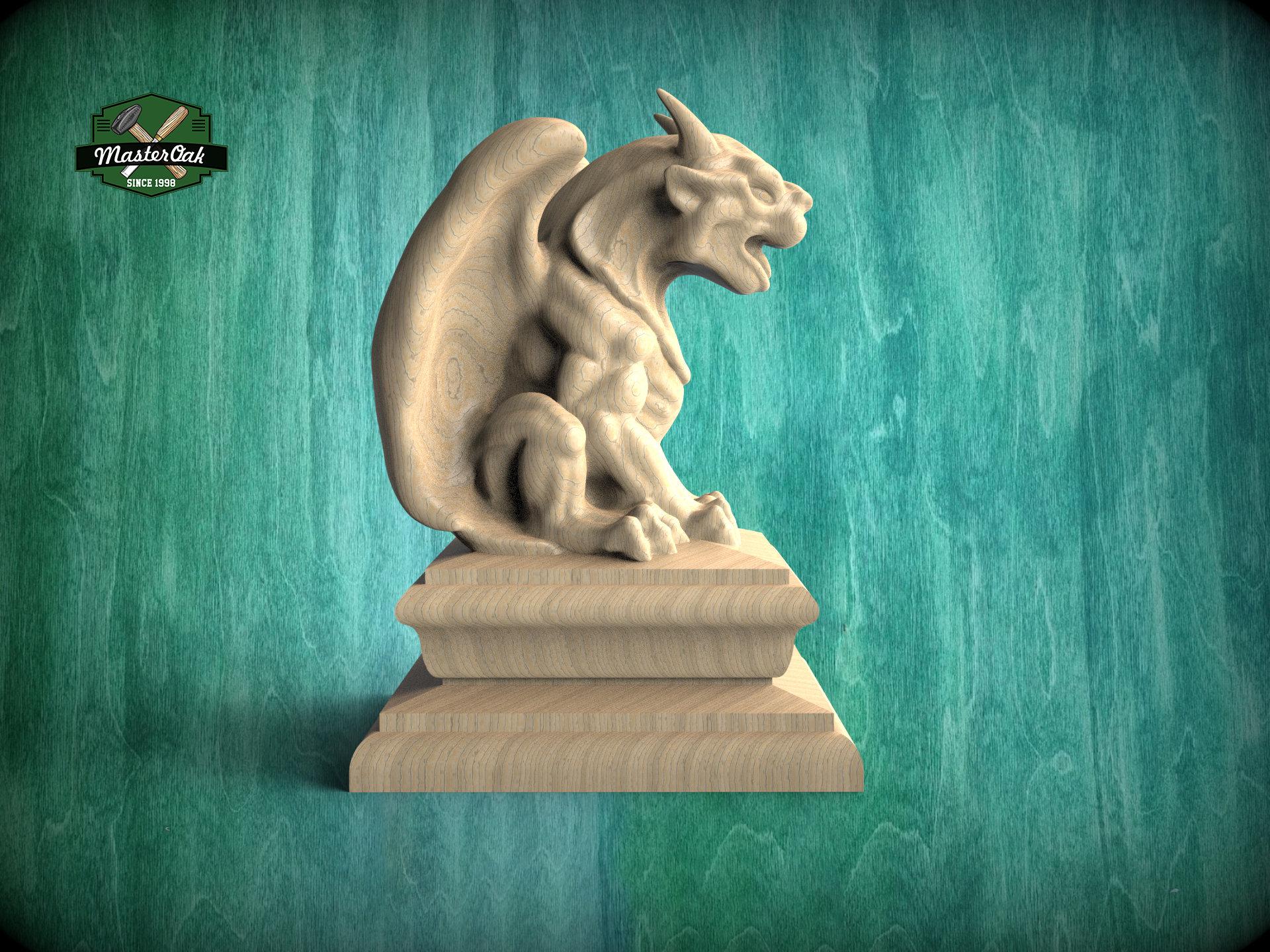 "Gargoyle wooden statue Unique wooden top for stair posts or balusters in the shape of a sittin...