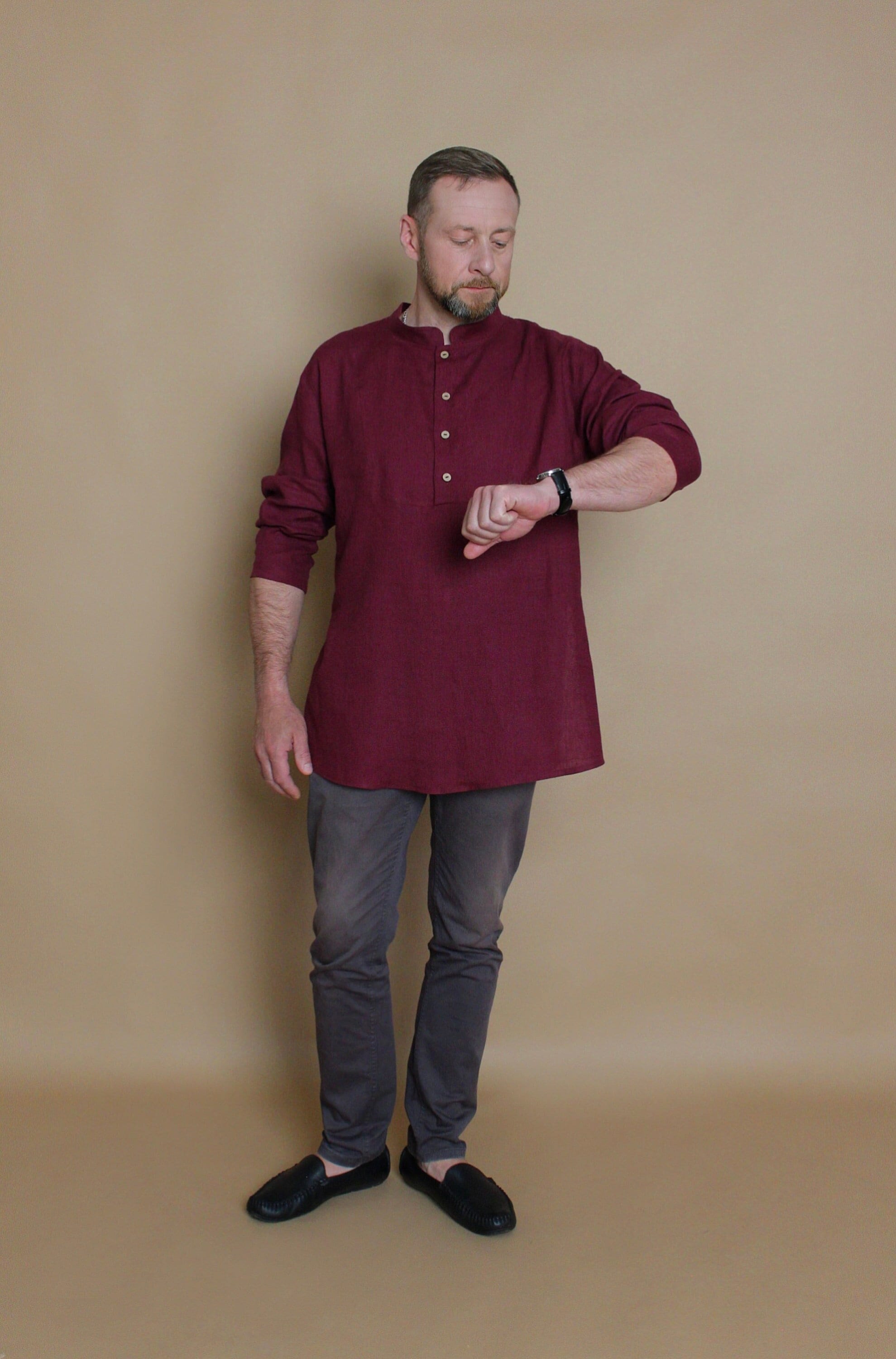 "Long sleeve marsala linen shirt-tunic for men features wooden buttons in front. Wear sleeves d...