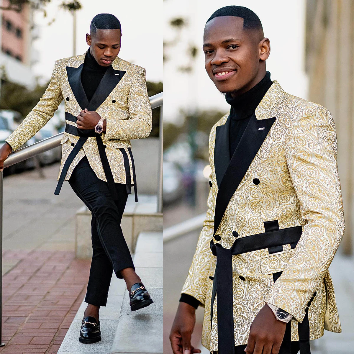 Men's Suits Tailored 2 Pieces Jacquard Blazer Pants Peaked Lapel Double Breasted With Belt Wedding F...