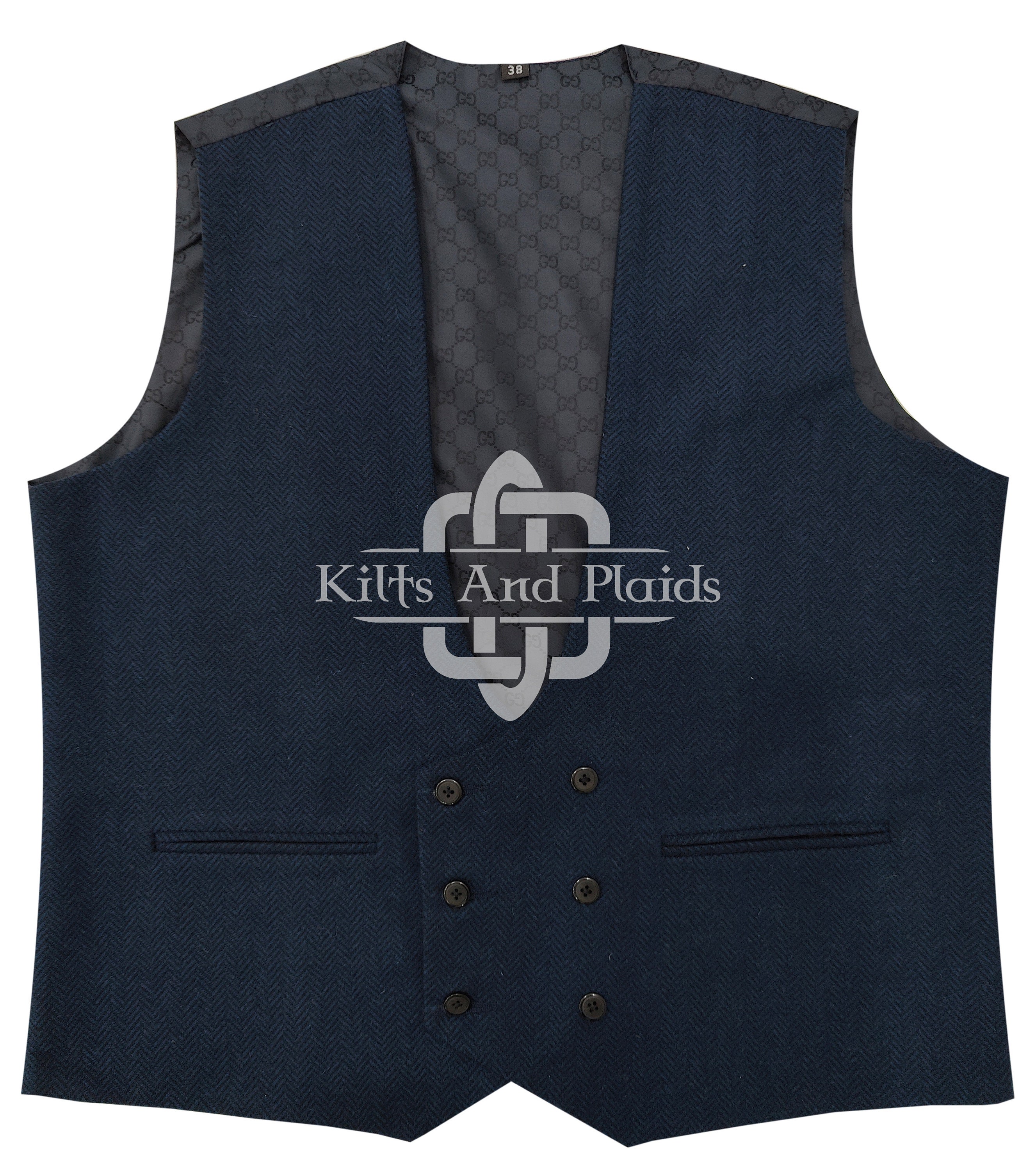 Navy Blue Herringbone Tweed Waistcoat - Double Breasted Scottish Ki...