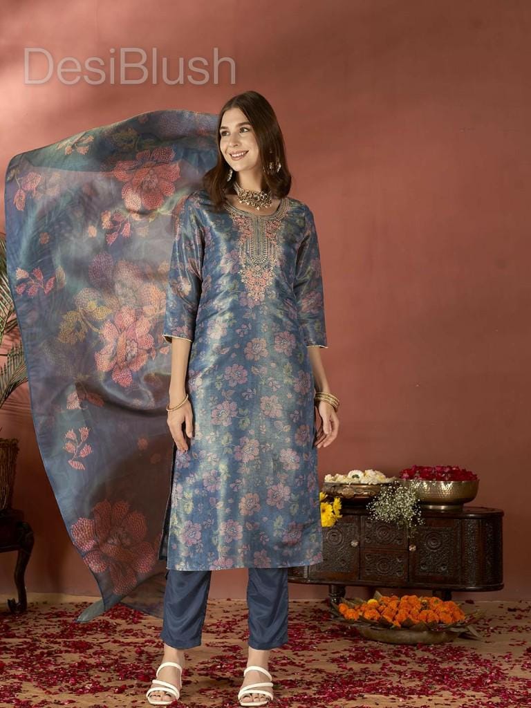 Silk Party Wear Kurta Set - Blue Embroidered Silk Straight Kurta wi...
