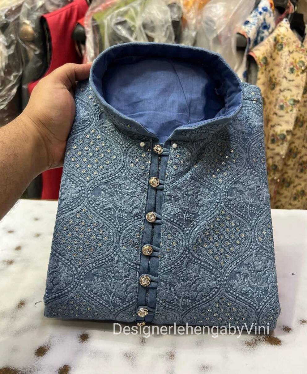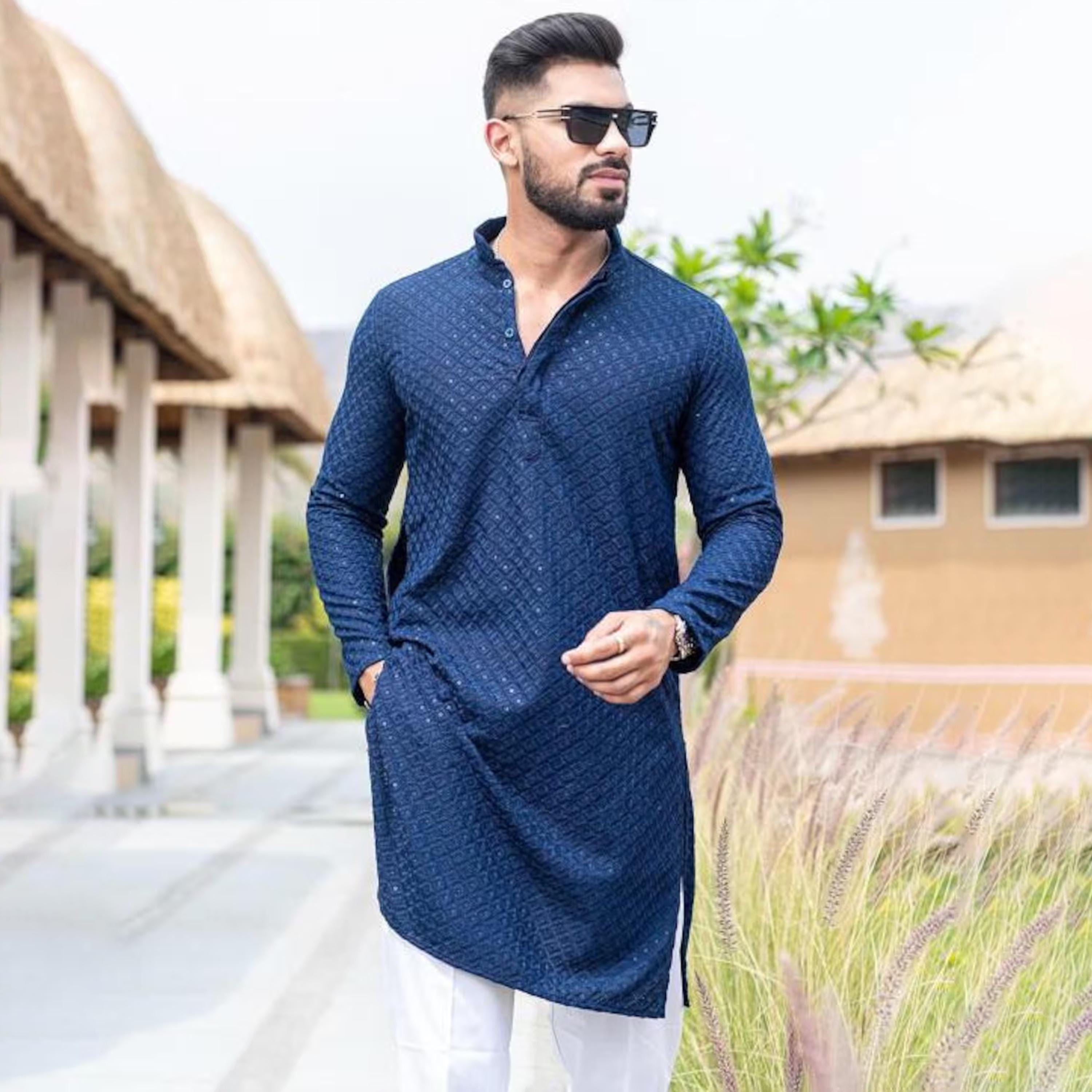 Blue Chikankari Work Ethnic Men's Kurta, Bollywood Style Kurta, Men...