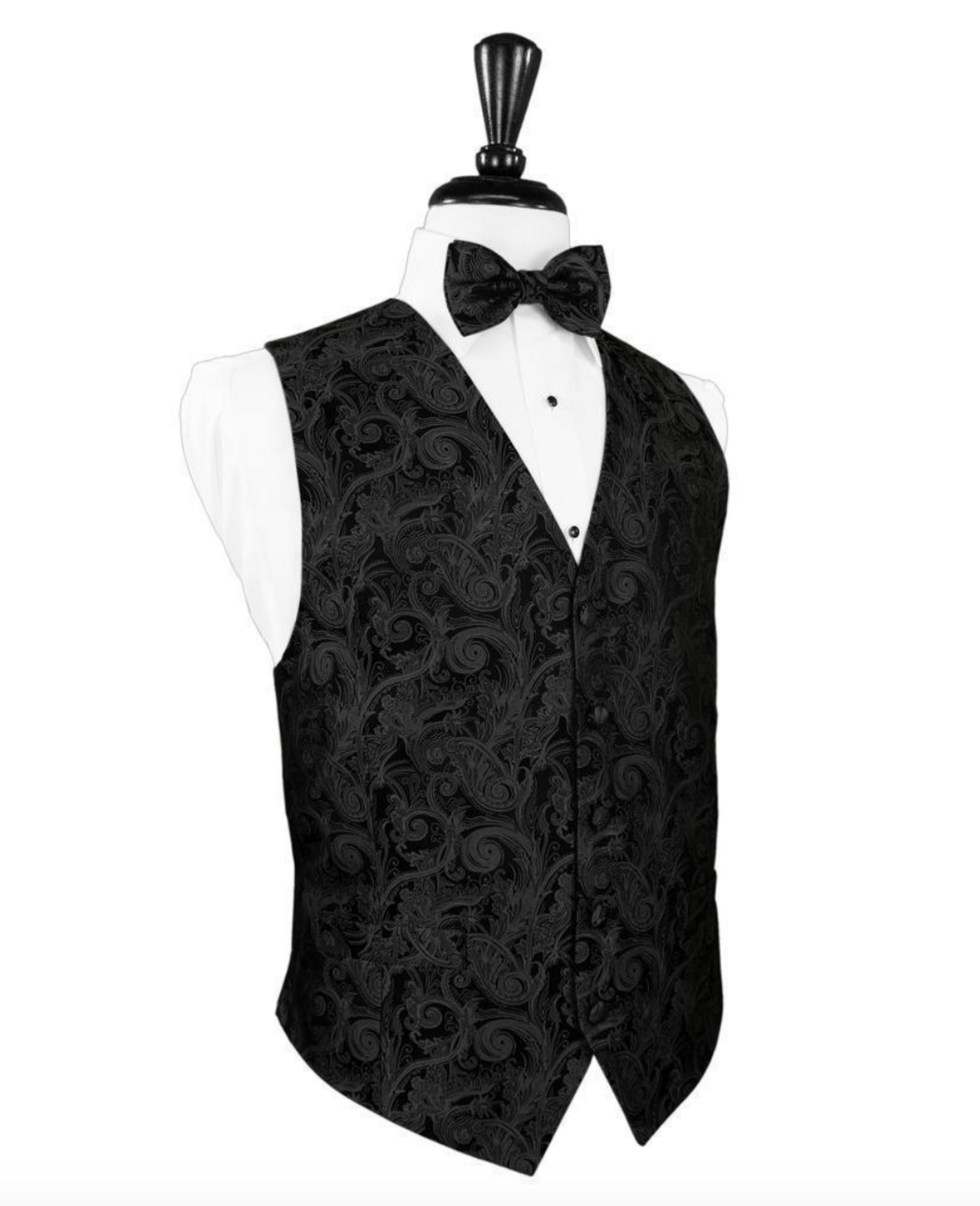Black Silk Paisley Tuxedo Vest with Matching Bow Tie - Luxury Men's...