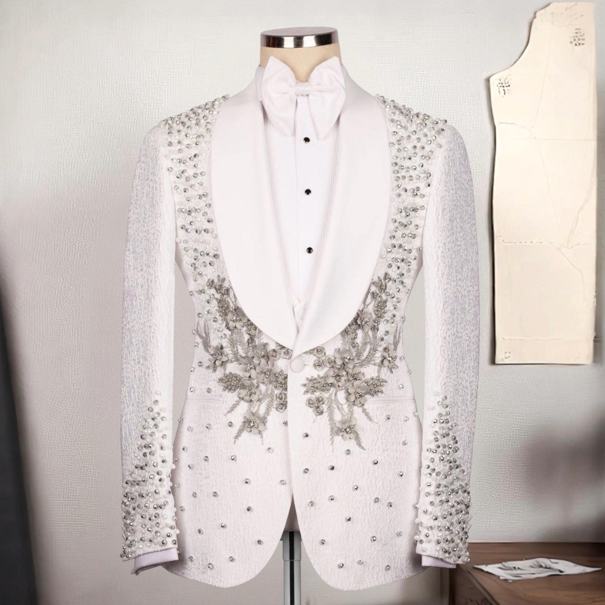 "Men's White Custom 3 Piece Tuxedo Set, Wedding Men's Tuxedo Suit, Men's Embroidered Tuxedo Ele...