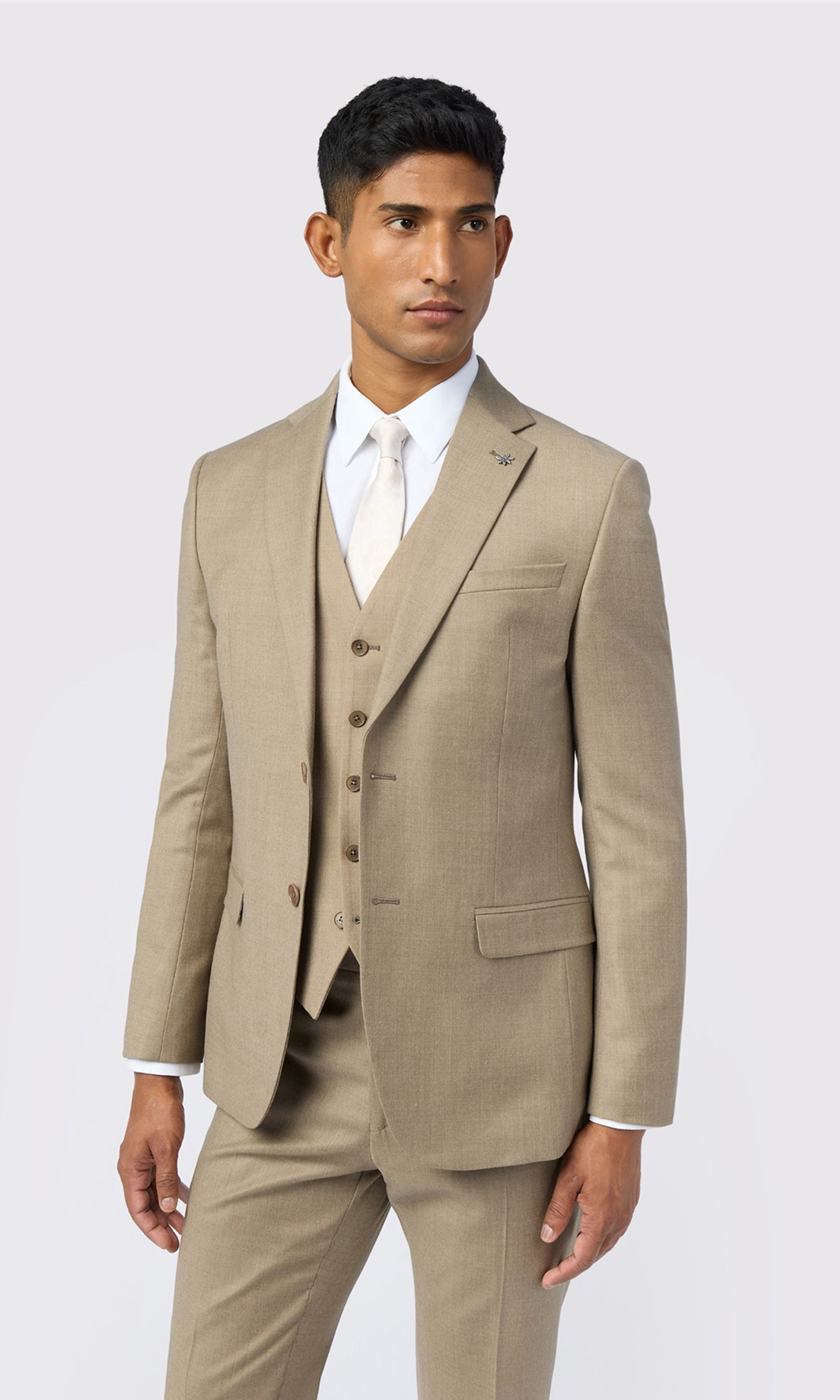 The Larkin oatmeal flannel suit jacket features a rich wool-blend with a hint of stretch for natural...