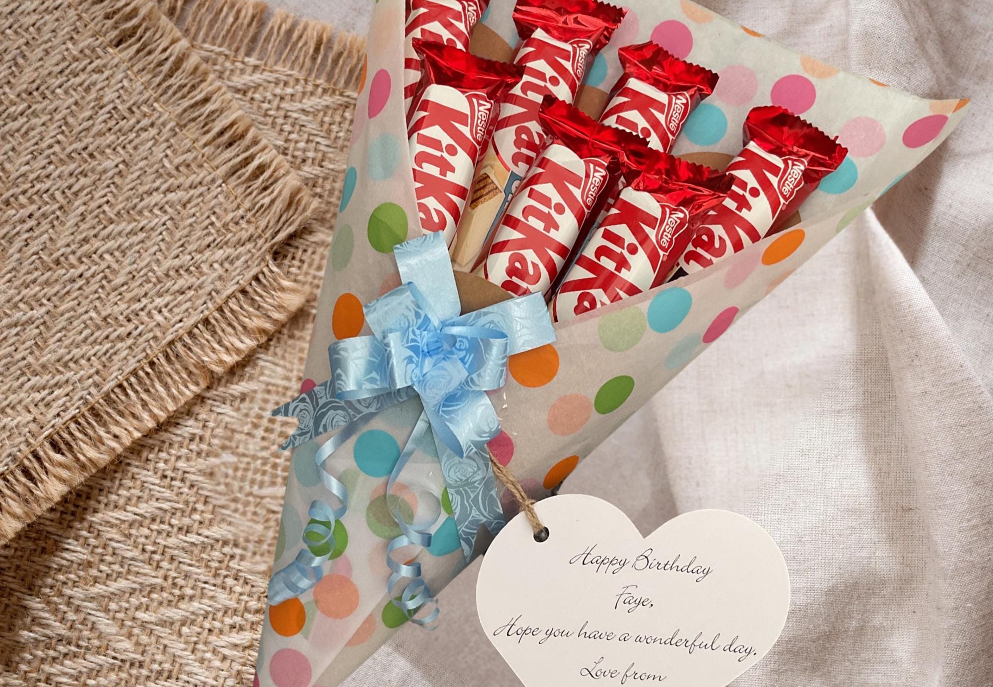 White chocolate Kit Kat bouquet with personalised gift tag and matc...