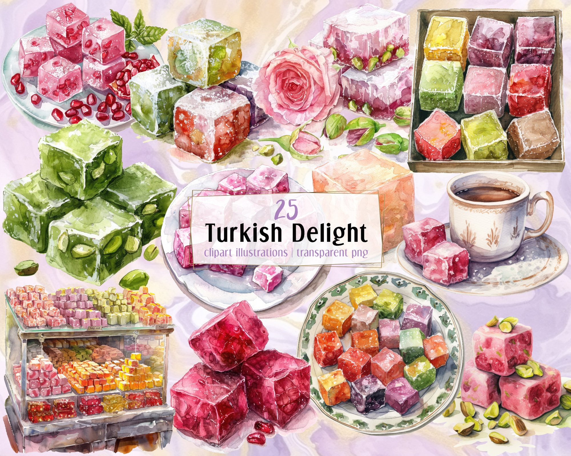 Delicious Turkish delight jelly candies, watercolor style clip arts with a transparent background. V...