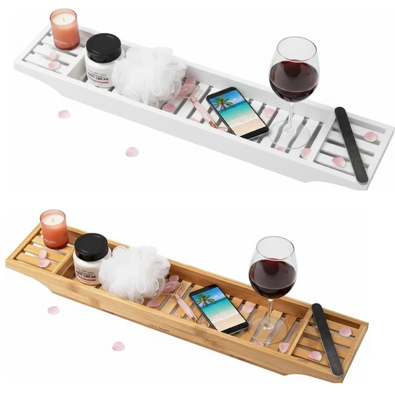 Natural Bamboo Bathtub Caddy Tray Bathroom Bath Shelf Organizer Spa Bath Tub Tray White Finish 70 cm