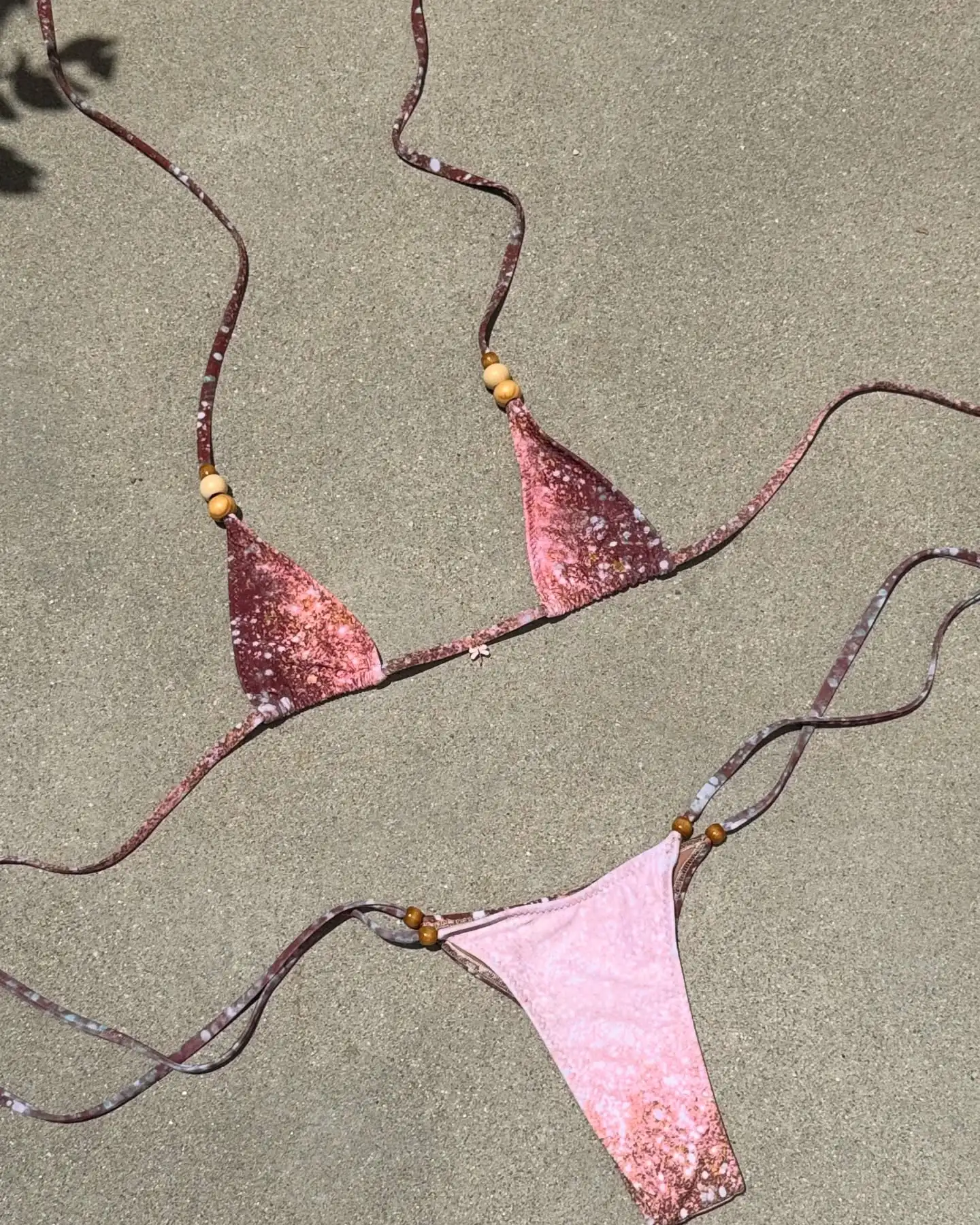 2025 Women's Two-Piece Swimsuit Pink Marble Pattern with Beaded Str...