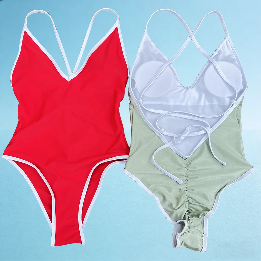 Women's Summer V-neck Swimsuit Slim Bikini One-piece Swimming Suit Bathwear Bathing Suits One Piece ...