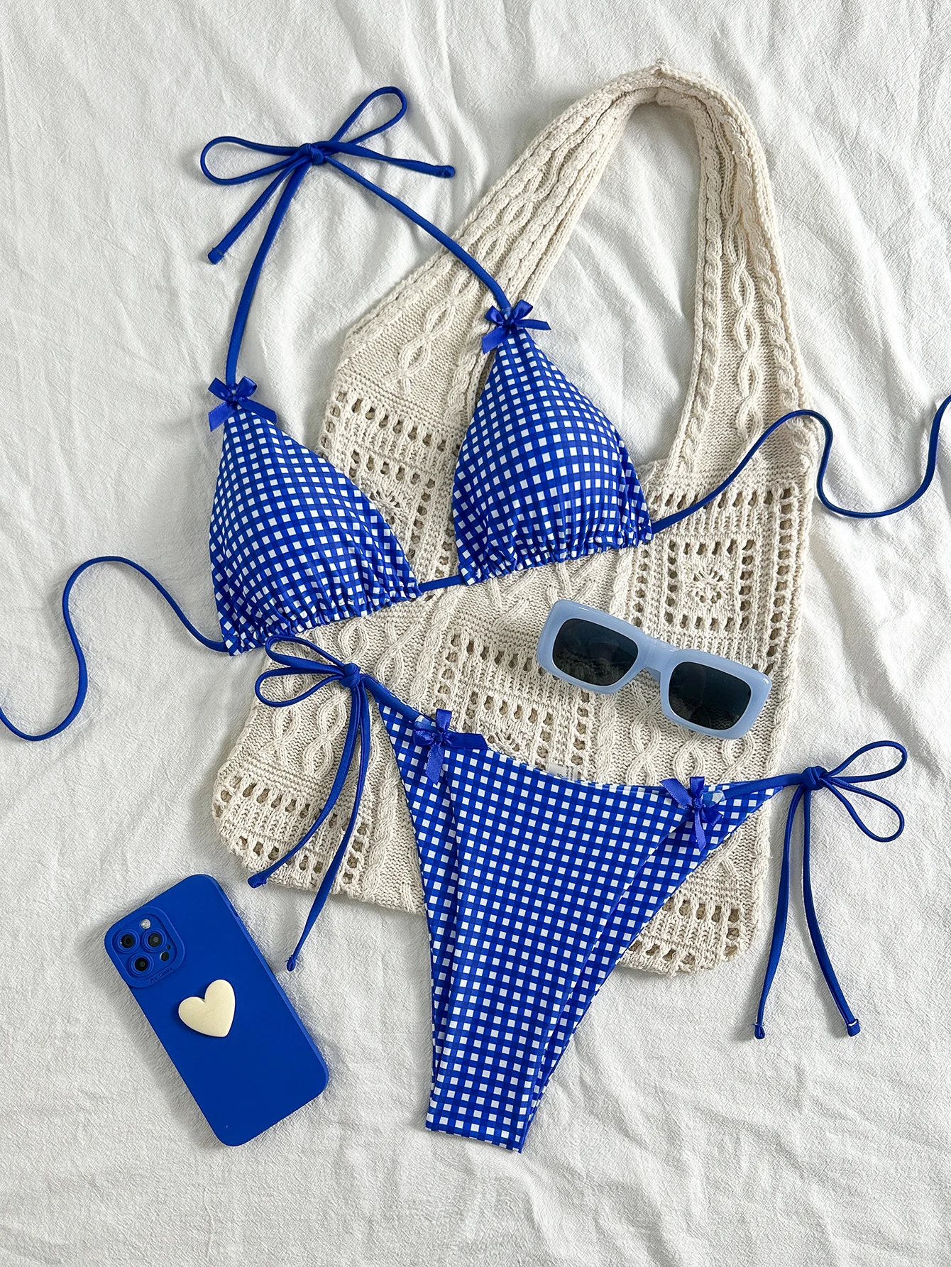 Women's Bikini Set, Ins-Style Picnic Mat Blue and White Checkered Two-Piece Swimsuit, Popular Bow-Ti...