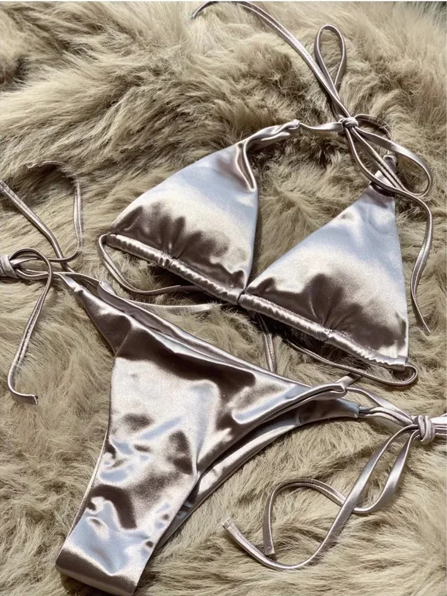 Wrap Around Halter Metallic Satin Bikini Women Swimwear Female Swimsuit Two-pieces Bikini Set Brazil...