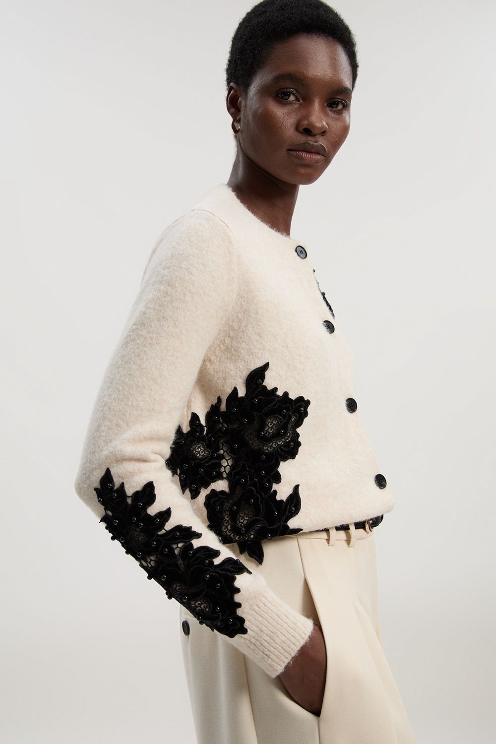 Karen Millen Womens Lace Embellished Cosy Knit Cardigan - Cream - S...