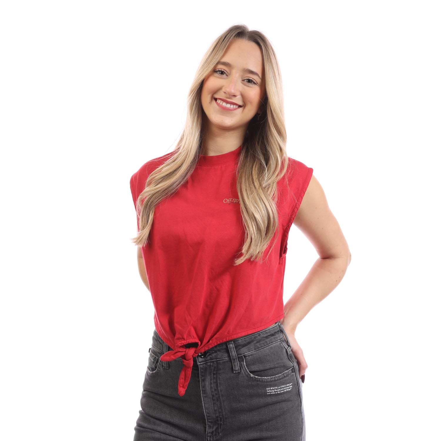 Womens Off White Arrow Crop Top in red.- Ribbed crewneck.- Sleeveless.- Knot front.- Printed logo.- ...