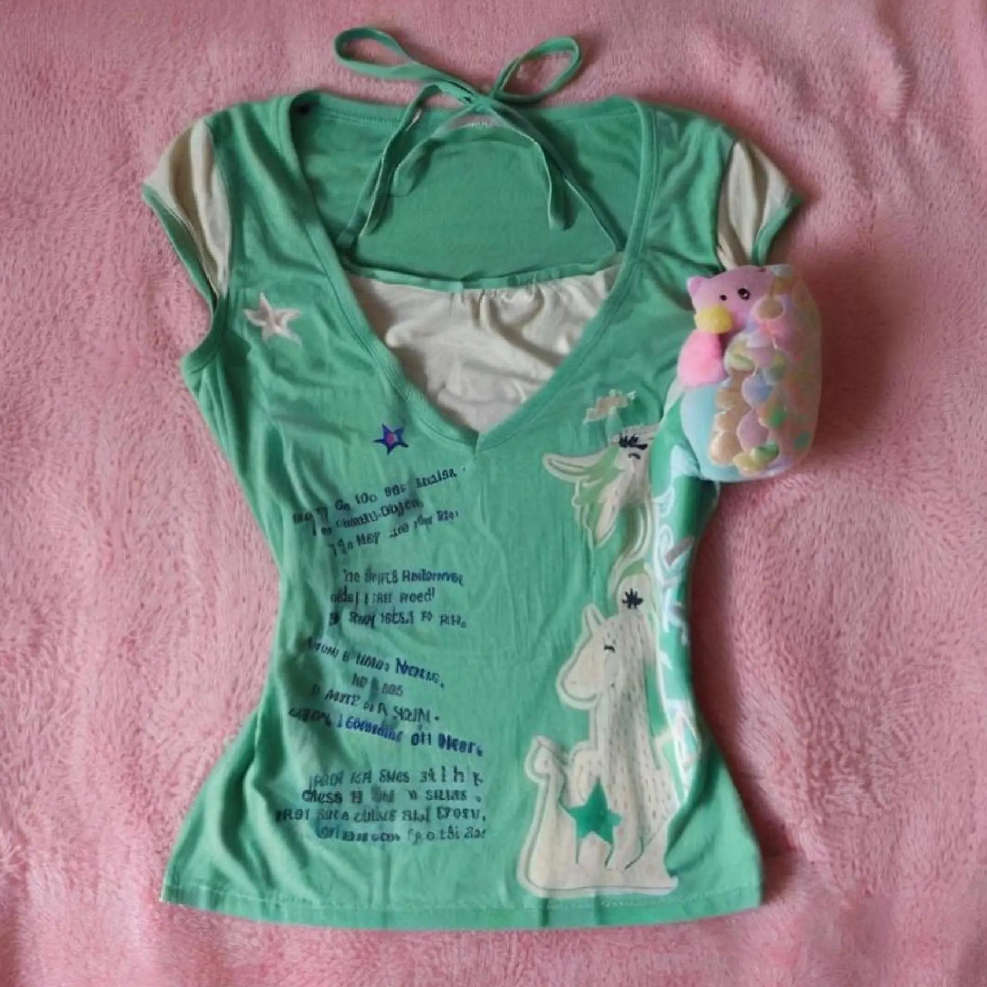 Retro American Style T-Shirt Cactus Slim Fit Short Sleeve Sweet And Spicy Y2K False Two-Piece Top fo...