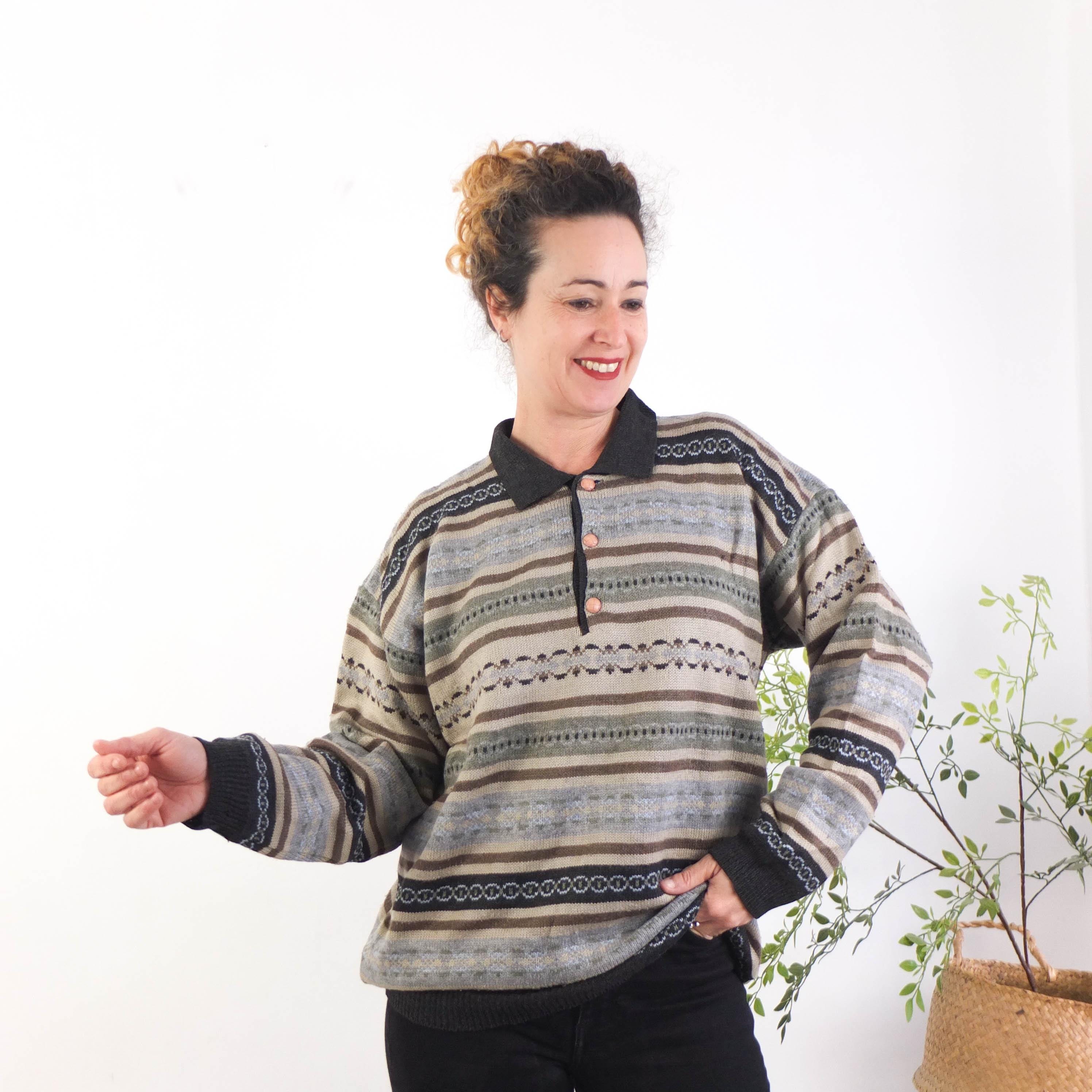 Vintage striped polo sweater, 90s striped acrylic collared sweater,...