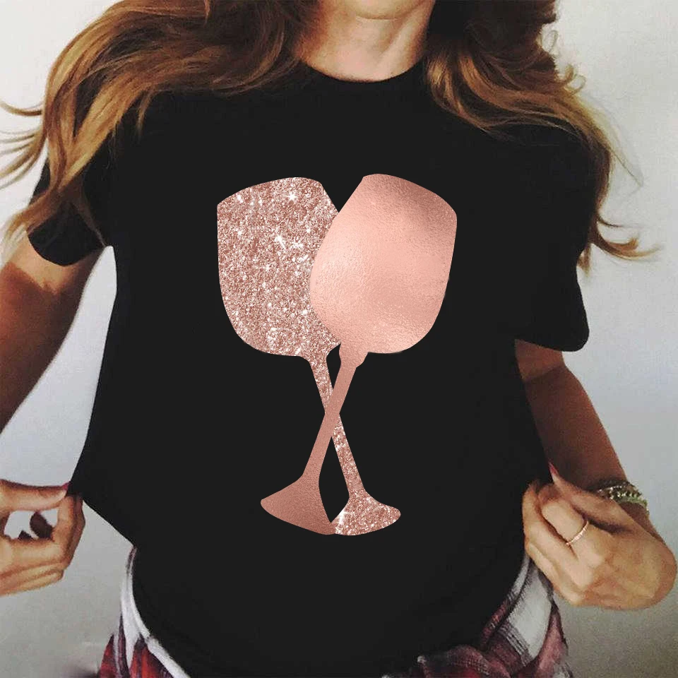 New Rose Gold Wine Glasses Tshirts Women Short-sleeve Tee Shirt Wine Glass Funny T Shirts 90s Ulzzan...