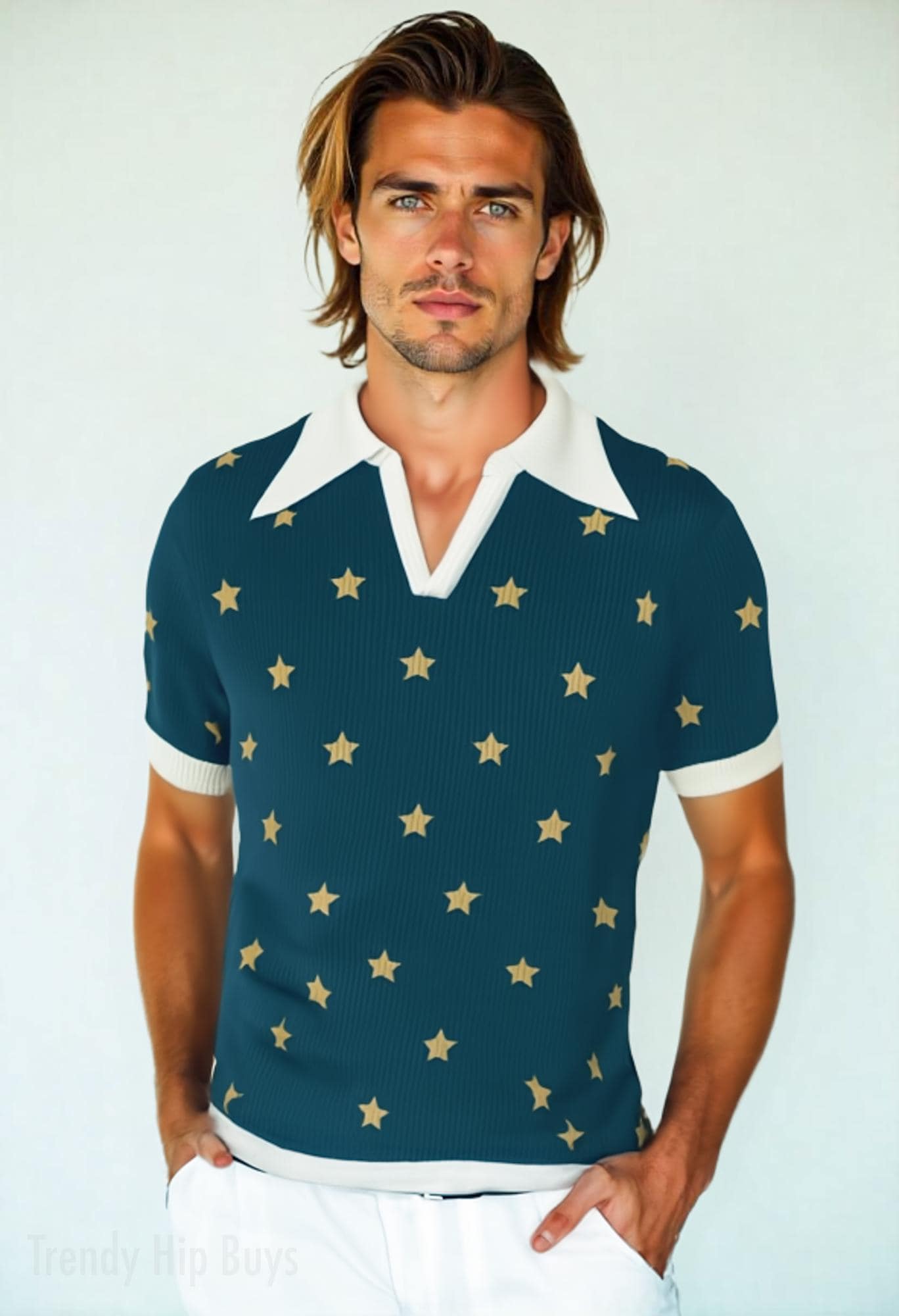 Retro Polo Shirt, Blue Star Polo Shirt, 70s Polo Shirt, Star Print ...