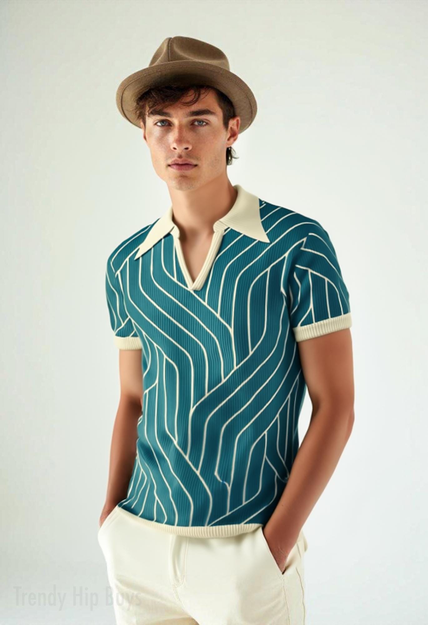 Step into true 70s style with this Men's Retro Teal Stripe Polo Shirt, designed with a standout cont...
