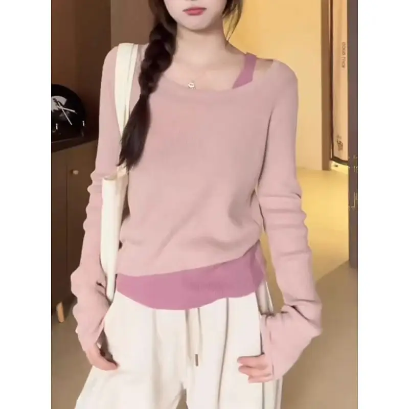 Pink Two Off Shoulder Knitwear Women's Autumn Outfit U-neck Long Sl...