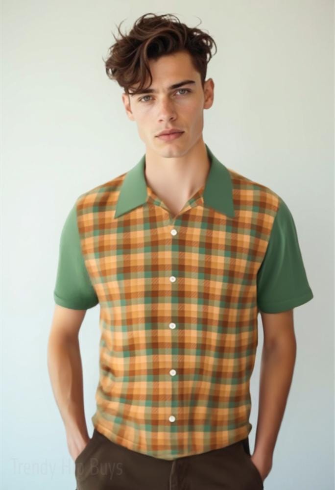 Upgrade your vintage wardrobe with our Men's 50s Inspired Retro Brown Plaid Shirt with Mint Green Co...