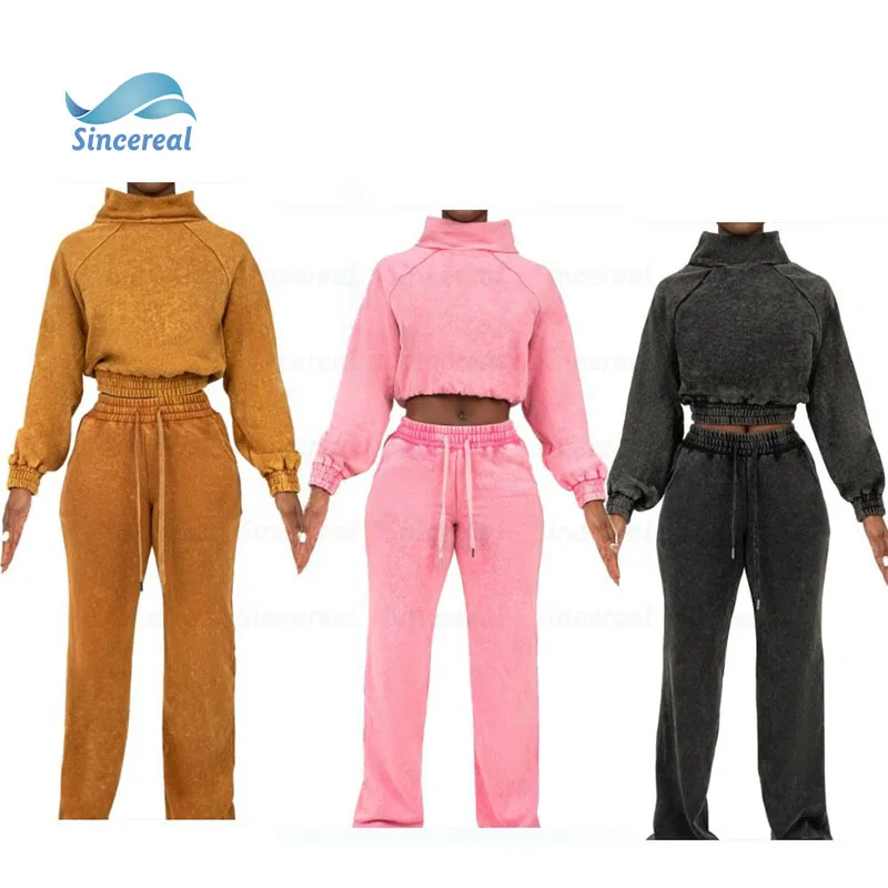 Custom Acid Wash Sweat Suit Women Funnel O-Neck Streetwear Sweatsui...
