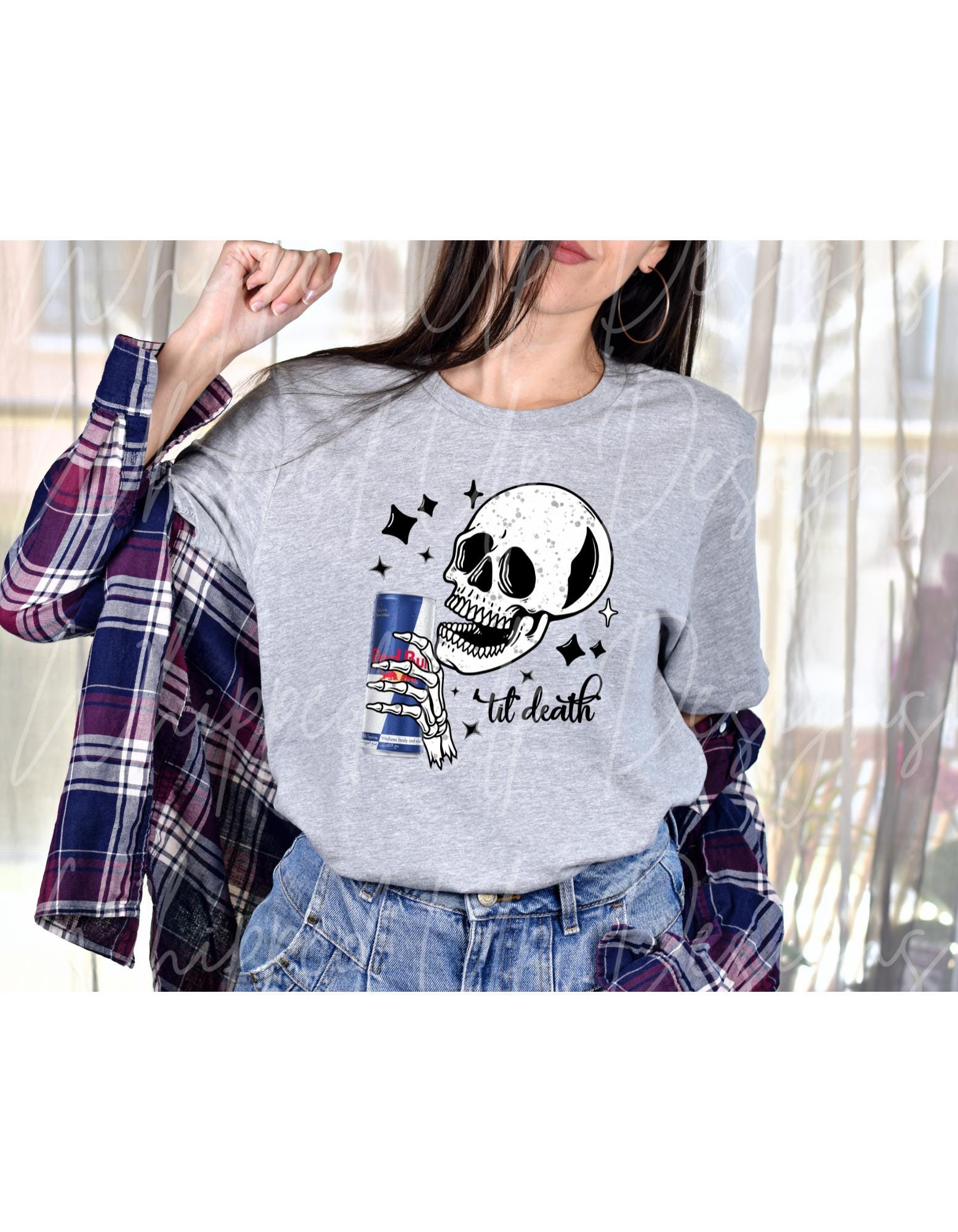 Express your love for Red Bull with this edgy T-shirt! Featuring a relaxed skeleton sipping on a can...