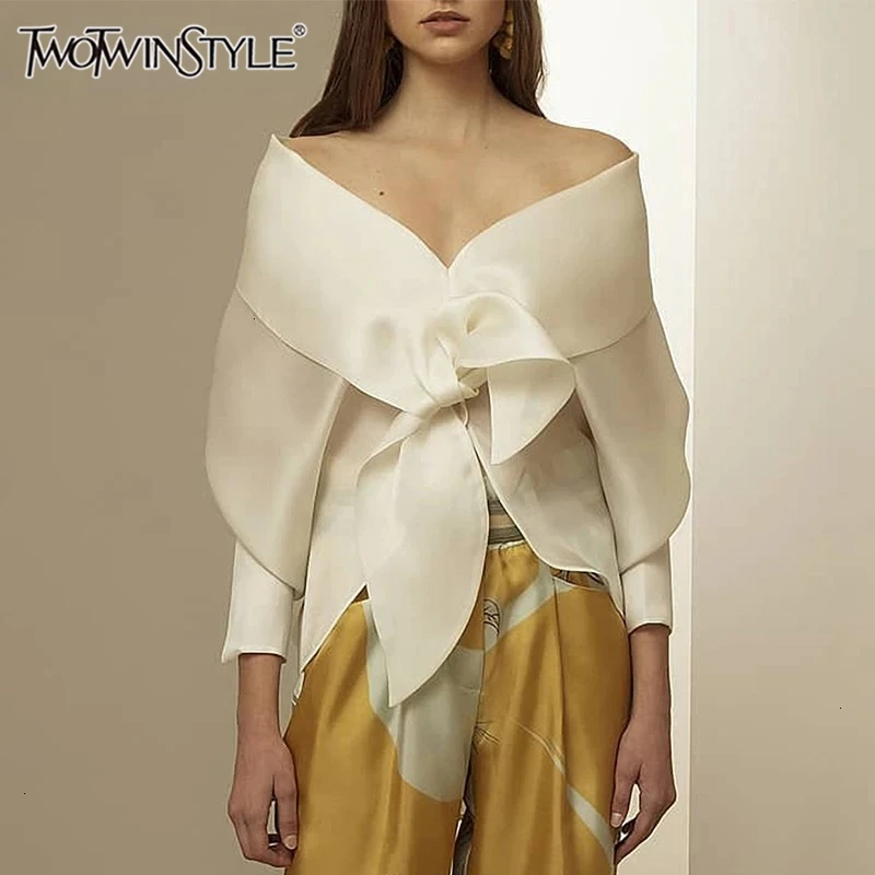 TWOTWINSTYLE Casual Loose Bow Lace up Chic Blouses Slash Neck Shoul...