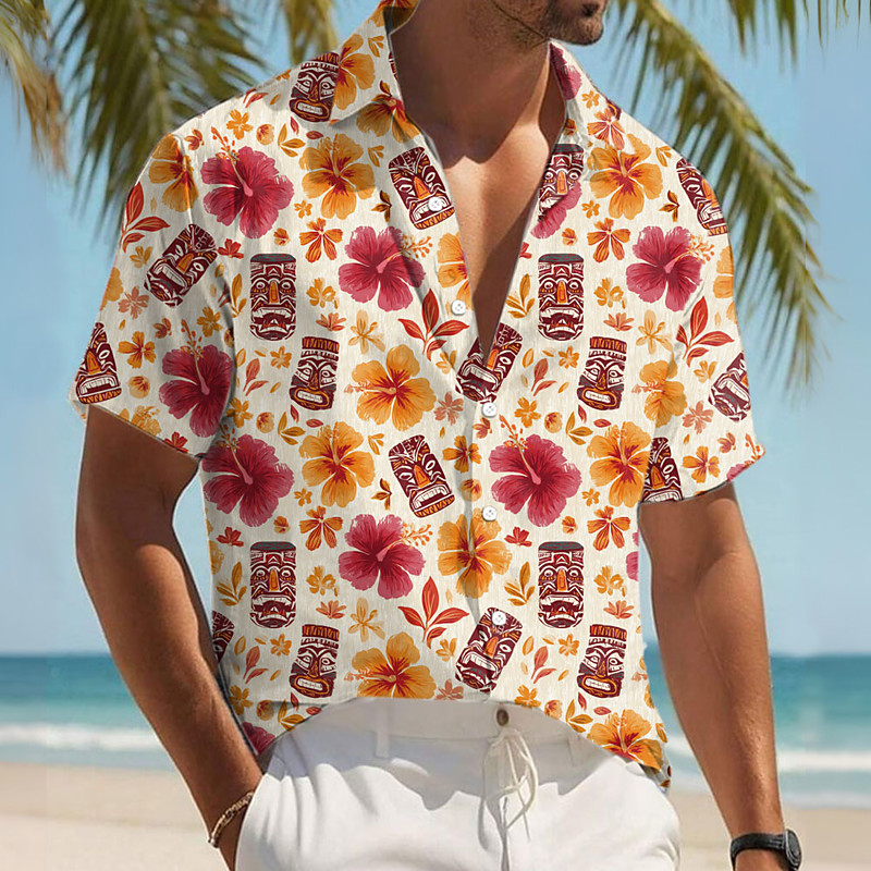 Men's Tropical Flowers Ethnic Tiki Shirt Summer Hawaiian Shirt Butt...