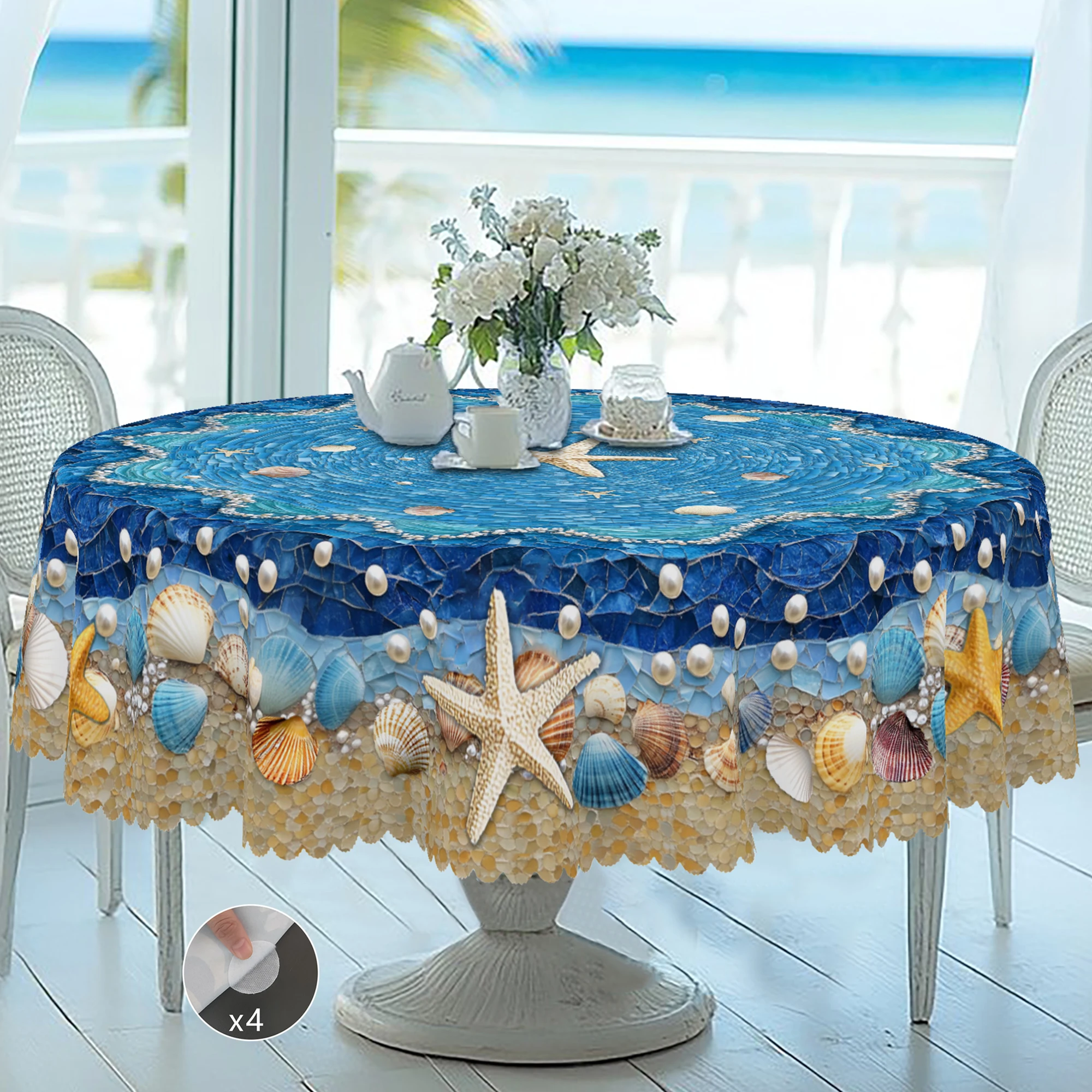 1 Piece of Summer Ocean Theme Blue Printed Tablecloth, Farmhouse Style, Ocean, Shell, Pearl Pattern ...