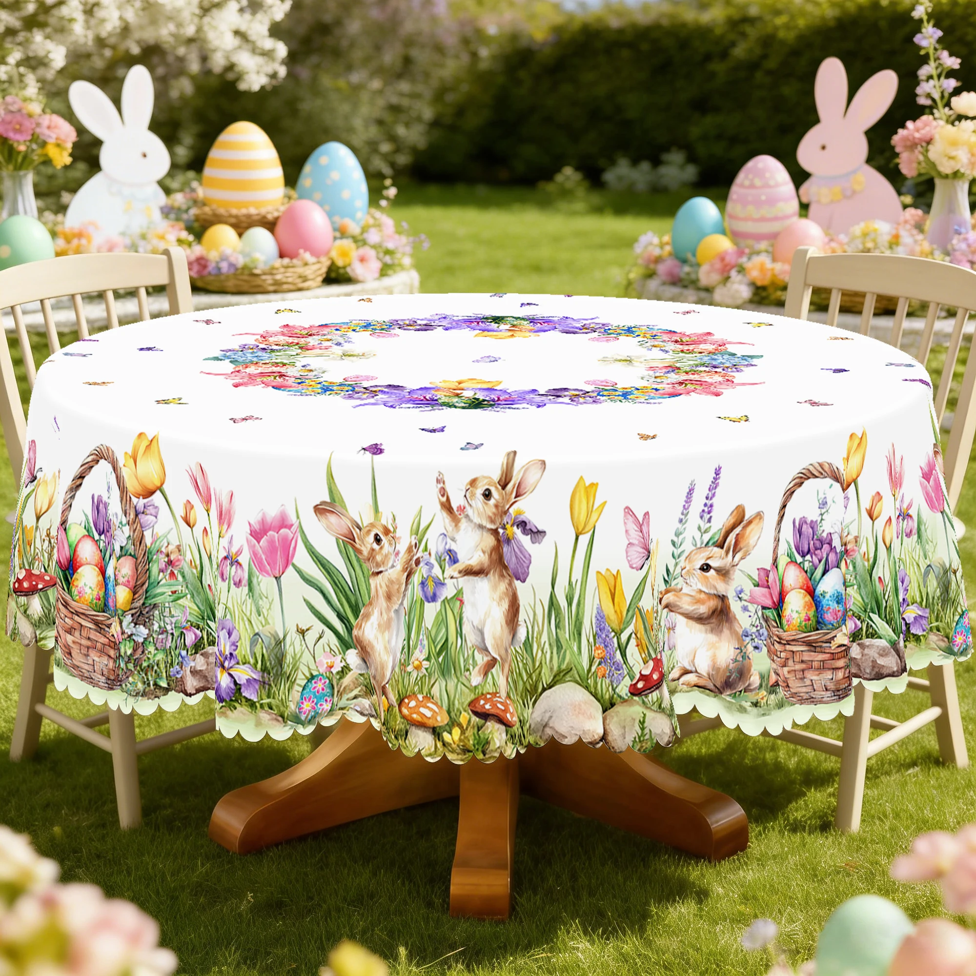 1 Piece Easter Printed Tablecloth, Cute Rabbits, Easter Eggs, Tulip Pattern Design, Perfect Holiday ...